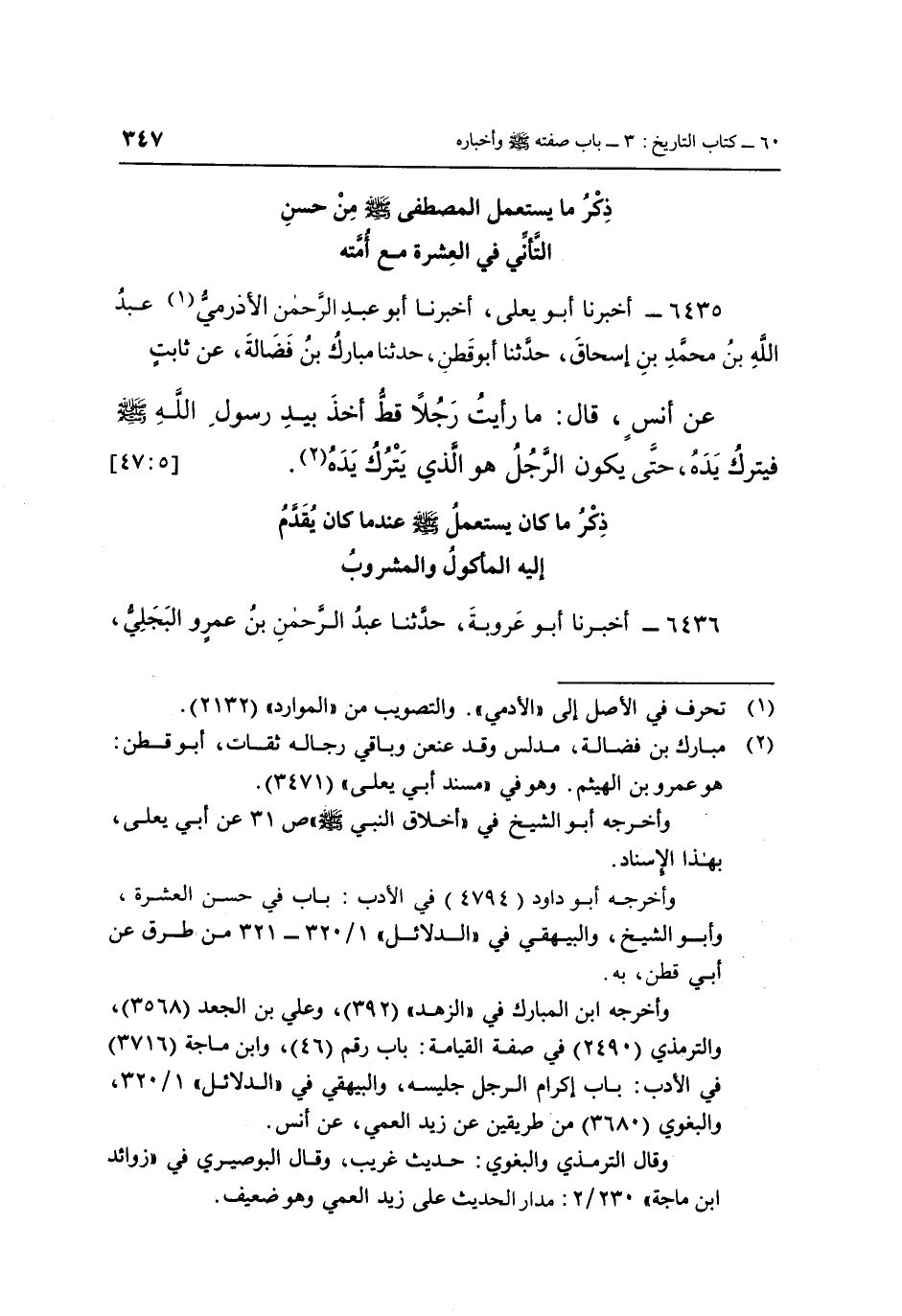6435 - أَخْبَرَنَا أَبُو يَعْلَى، أَخْبَرَنَا أَبُو عَبْدِ الرَّحْمَنِ الْأَذْرَمِيُّ (1) عَبْدُ اللَّهِ بْنُ مُحَمَّدِ بْنِ إِسْحَاقَ، حَدَّثَنَا أَبُو قَطَنٍ، حَدَّثَنَا مُبَارَكُ بْنُ فَضَالَةَ، عَنْ ثَابِتٍ، عَنْ أَنَسٍ، قَالَ: «مَا رَأَيْتُ رَجُلًا قَطُّ أَخَذَ بِيَدِ رَسُولِ اللَّهِ صَلَّى اللَّهُ عَلَيْهِ وَسَلَّمَ فَيَتْرُكُ يَدَهُ حَتَّى يَكُونَ الرَّجُلُ هُوَ الَّذِي يَتْرُكُ يَدَهُ» (2) . [5: 47]