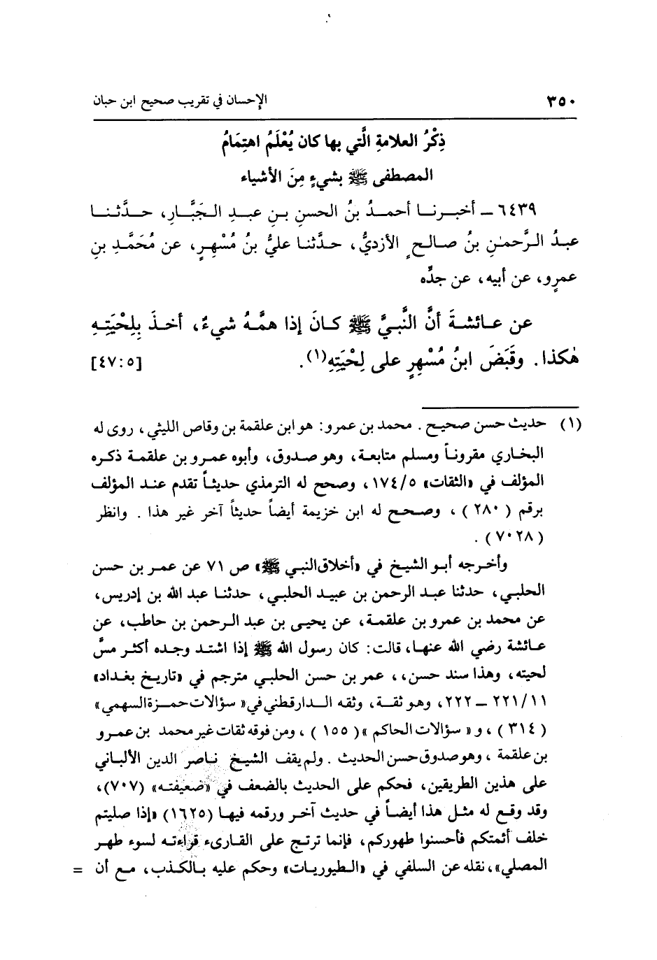 6439 - أَخْبَرَنَا أَحْمَدُ بْنُ الْحَسَنِ بْنِ عَبْدِ الْجَبَّارِ، حَدَّثَنَا عَبْدُ الرَّحْمَنِ بْنُ صَالِحٍ الْأَزْدِيُّ، حَدَّثَنَا عَلِيُّ بْنُ مُسْهِرٍ، عَنْ مُحَمَّدِ بْنِ عَمْرٍو، عَنْ أَبِيهِ، عَنْ جَدِّهِ، عَنْ عَائِشَةَ: «أَنَّ النَّبِيَّ صَلَّى اللَّهُ عَلَيْهِ وَسَلَّمَ كَانَ إِذَا هَمَّهُ شَيْءٌ أَخَذَ بِلِحْيَتِهِ هَكَذَا، وَقَبَضَ ابْنُ مُسْهِرٍ عَلَى لِحْيَتِهِ» (1) . [5: 47]