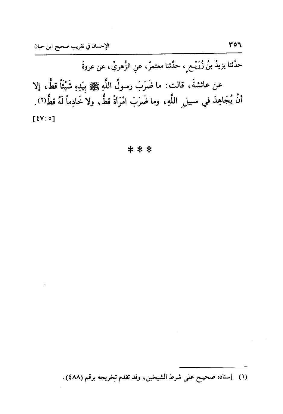حَدَّثَنَا يَزِيدُ بْنُ زُرَيْعٍ، حَدَّثَنَا مَعْمَرٌ، عَنِ الزُّهْرِيِّ، عَنْ عُرْوَةَ، عَنْ عَائِشَةَ، قَالَتْ: «مَا ضَرَبَ رَسُولُ اللَّهِ صَلَّى اللَّهُ عَلَيْهِ وَسَلَّمَ بِيَدِهِ شَيْئًا قَطُّ إِلَّا أَنْ يُجَاهِدَ فِي سَبِيلِ اللَّهِ، وَمَا ضَرَبَ امْرَأَةً قَطُّ، وَلَا خَادِمًا قَطُّ» (1) . [5: 47]