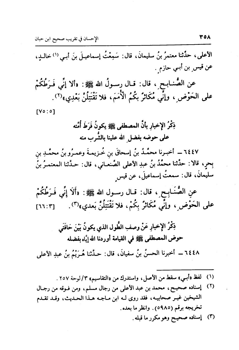 6447 - أَخْبَرَنَا مُحَمَّدُ بْنُ إِسْحَاقَ بْنِ خُزَيْمَةَ، وَعَمْرُو بْنُ مُحَمَّدِ بْنِ بَحْرٍ، قَالَا: حَدَّثَنَا مُحَمَّدُ بْنُ عَبْدِ الْأَعْلَى الصَّنْعَانِيُّ، قَالَ حَدَّثَنَا الْمُعْتَمِرُ بْنُ سُلَيْمَانَ، قَالَ: سَمِعْتُ إِسْمَاعِيلَ، عَنْ قَيْسٍ، عَنِ الصُّنَابِحِ، قَالَ: قَالَ رَسُولُ اللَّهِ صَلَّى اللَّهُ عَلَيْهِ وَسَلَّمَ: «أَلَا إِنِّي فَرَطُكُمْ عَلَى الْحَوْضِ، وَإِنِّي مُكَاثِرٌ بِكُمْ، فَلَا تَقْتَتِلُنَّ بَعْدِي» (3) . [3: 66]