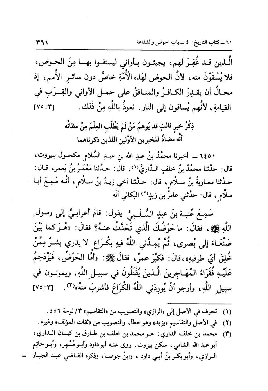 (3) محمد بن خلف الداري: هو محمد بن خلف بن طارق بن كيسان الداري، أبو عبد الله الشامي، سكن بيروت. روى عنه أبو داود وأبو مُسْهِر، وأبو حاتِم الرازي، وأبو بكر بنُ أبي داود، وابنُ جوصا، وذكره القاضي عبد الجبار =