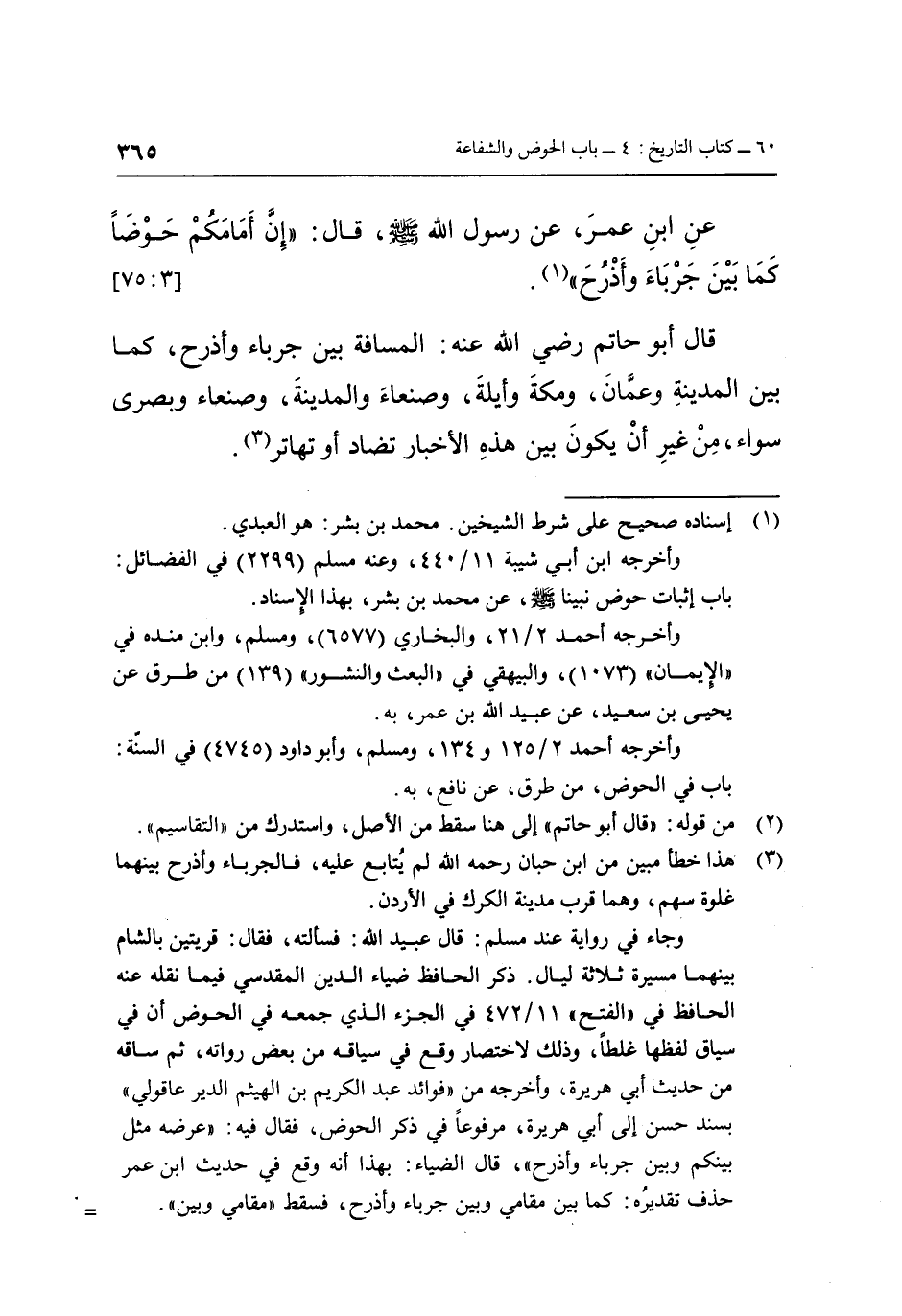 عَنِ ابْنِ عُمَرَ، عَنْ رَسُولِ اللَّهِ صَلَّى اللَّهُ عَلَيْهِ وَسَلَّمَ، قَالَ: «إِنَّ أَمَامَكُمْ حَوْضًا كَمَا بَيْنَ جَرْبَاءَ، وَأَذْرُحَ» (1) . [3: 75]
