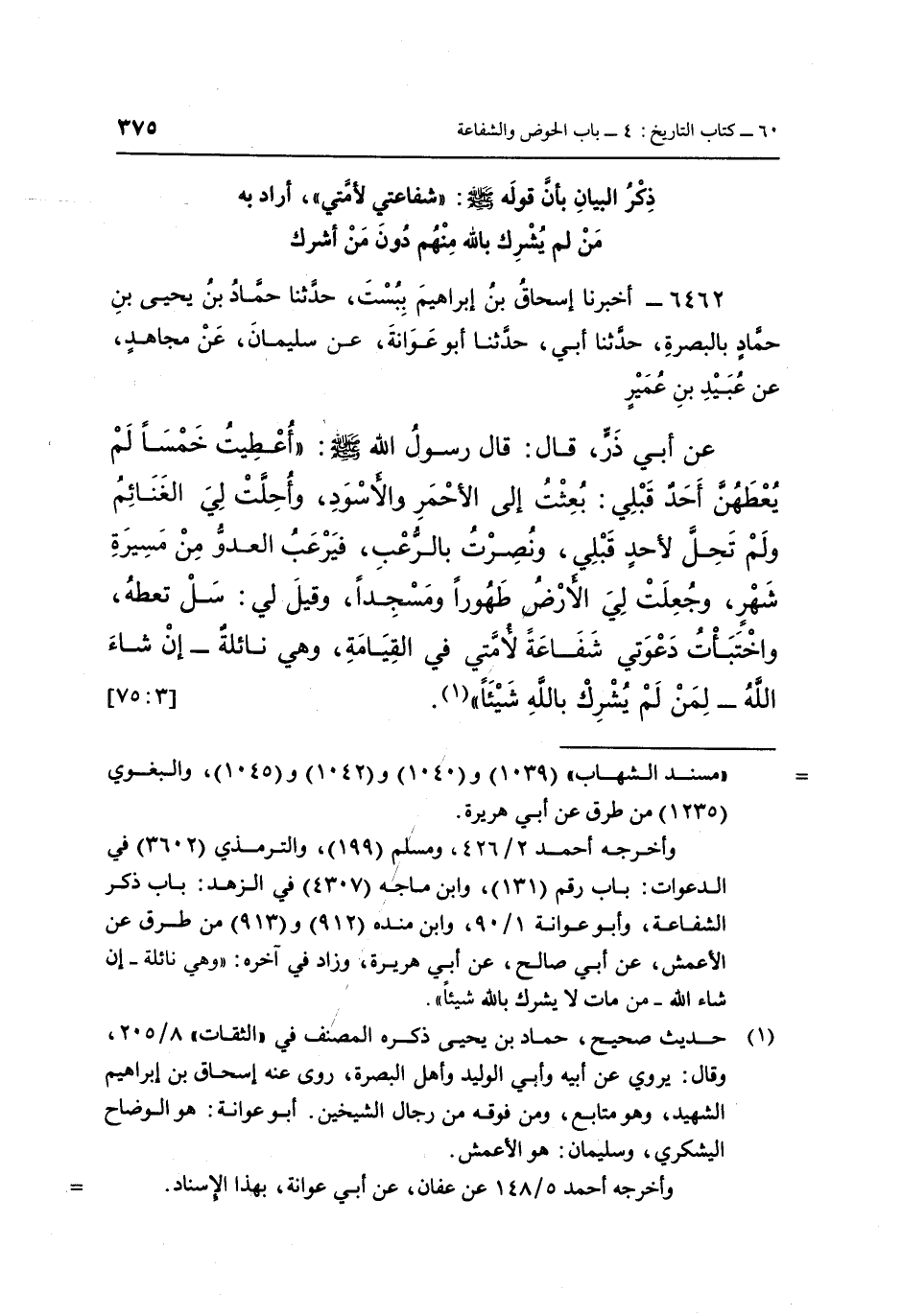 6462 - أَخْبَرَنَا إِسْحَاقُ بْنُ إِبْرَاهِيمَ، بِبُسْتَ، حَدَّثَنَا حَمَّادُ بْنُ يَحْيَى بْنِ حَمَّادٍ، بِالْبَصْرَةِ، حَدَّثَنَا أَبِي، حَدَّثَنَا أَبُو عَوَانَةَ، عَنْ سُلَيْمَانَ، عَنْ مُجَاهِدٍ، عَنْ عُبَيْدِ بْنِ عُمَيْرٍ، عَنْ أَبِي ذَرٍّ، قَالَ: قَالَ رَسُولُ اللَّهِ صَلَّى اللَّهُ عَلَيْهِ وَسَلَّمَ: «أُعْطِيتُ خَمْسًا لَمْ يُعْطَهُنَّ أَحَدٌ قَبْلِي: بُعِثْتُ إِلَى الْأَحْمَرِ وَالْأَسْوَدِ، وَأُحِلَّتْ لِيَ الْغَنَائِمَ، وَلَمْ تَحِلَّ لِأَحَدٍ قَبْلِي، وَنُصِرْتُ بِالرُّعْبِ، فَيُرْعَبُ الْعَدُوُّ مِنْ مَسِيرَةِ شَهْرٍ، وَجُعِلَتْ لِيَ الْأَرْضُ طَهُورًا وَمَسْجِدًا، وَقِيلَ لِي: سَلْ تُعْطَهْ، وَاخْتَبَأْتُ دَعْوَتِي شَفَاعَةً لِأُمَّتِي فِي الْقِيَامَةِ، وَهِيَ نَائِلَةٌ - إِنْ شَاءَ اللَّهُ - لِمَنْ لَمْ يُشْرِكْ بِاللَّهِ شَيْئًا» (1) . [3: 75]