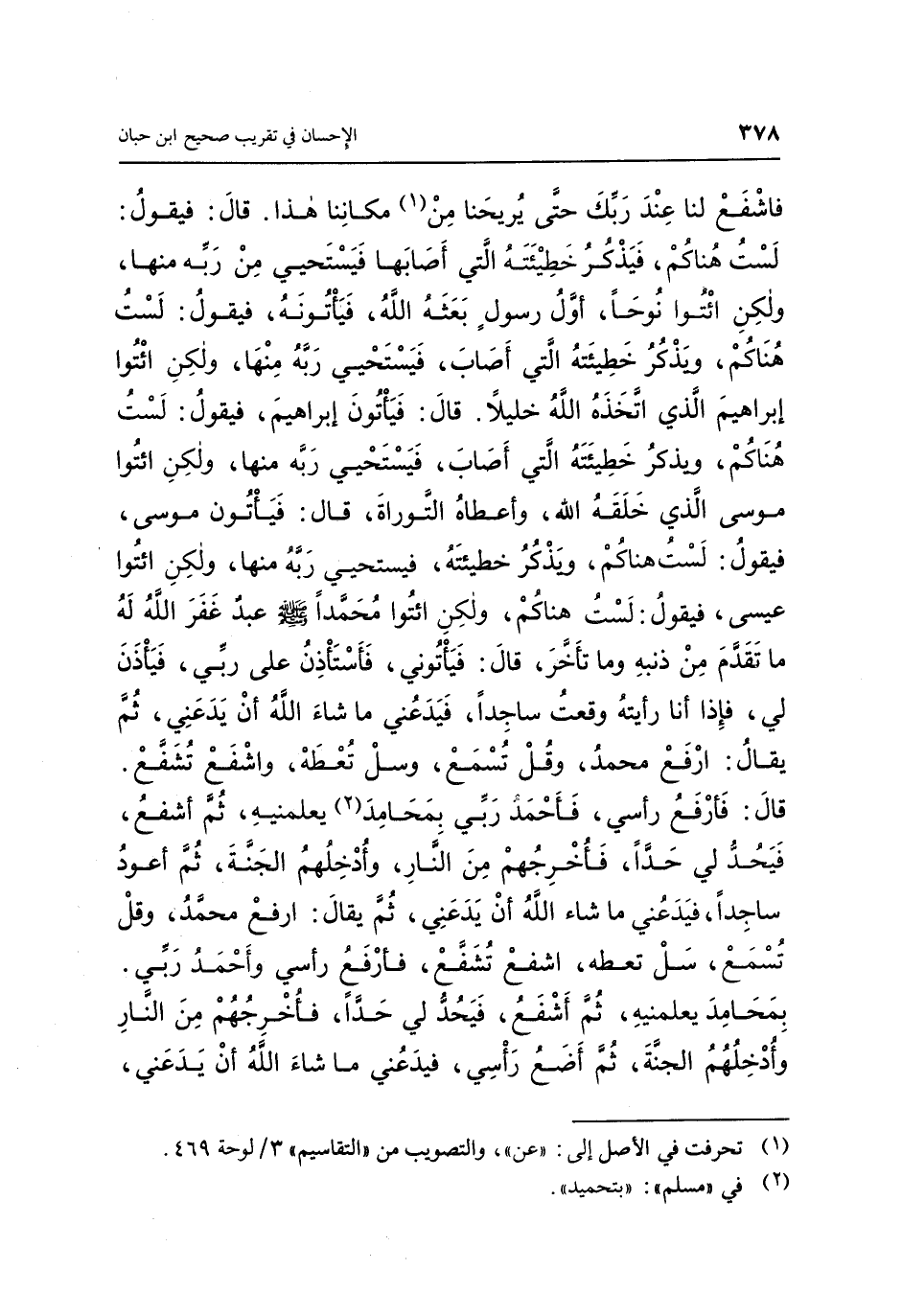 فَاشْفَعْ لَنَا عِنْدَ رَبِّكَ حَتَّى يُرِيحَنَا مِنْ (1) مَكَانِنَا هَذَا، قَالَ: فَيَقُولُ: لَسْتُ هُنَاكُمْ، فَيَذْكُرُ خَطِيئَتَهُ الَّتِي أَصَابَهَا، فَيَسْتَحْيِي مِنْ رَبِّهِ مِنْهَا، وَلَكِنِ ائْتُوا نُوحًا أَوَّلَ رَسُولٍ بَعَثَهُ اللَّهُ، فَيَأْتُونَهُ، فَيَقُولُ: لَسْتُ هُنَاكُمْ، وَيُذْكَرُ خَطِيئَتَهُ الَّتِي أَصَابَ، فَيَسْتَحْيِي رَبَّهُ مِنْهَا، وَلَكِنِ ائْتُوا إِبْرَاهِيمَ الَّذِي اتَّخَذَهُ اللَّهُ خَلِيلًا، قَالَ: فَيَأْتُونَ إِبْرَاهِيمَ، فَيَقُولُ: لَسْتُ هُنَاكُمْ، وَيُذْكَرُ خَطِيئَتَهُ الَّتِي أَصَابَ فَيَسْتَحْيِي رَبَّهُ مِنْهَا، وَلَكِنِ ائْتُوا مُوسَى الَّذِي خَلْقَهُ اللَّهُ وَأَعْطَاهُ التَّوْرَاةَ، قَالَ: فَيَأْتُونَ مُوسَى، فَيَقُولُ: لَسْتُ هُنَاكُمْ، وَيُذْكَرُ خَطِيئَتَهُ، فَيَسْتَحْيِي رَبَّهُ مِنْهَا، وَلَكِنِ ائْتُوا عِيسَى، فَيَقُولُ: لَسْتُ هُنَاكُمْ، وَلَكِنِ ائْتُوا مُحَمَّدًا صَلَّى اللَّهُ عَلَيْهِ وَسَلَّمَ عَبْدٌ غَفَرَ اللَّهُ لَهُ مَا تَقَدَّمَ مِنْ ذَنْبِهِ، وَمَا تَأَخَّرَ، قَالَ: فَيَأْتُونِي، فَأَسْتَأْذِنُ عَلَى رَبِّي، فَيَأْذَنُ لِي، فَإِذَا أَنَا رَأَيْتُهُ وَقَعَتْ سَاجِدًا، فَ يَدَعُنِي مَا شَاءَ اللَّهُ أَنْ يَدَعَنِي، ثُمَّ يُقَالُ: ارْفَعْ مُحَمَّدُ، وَقُلْ تُسْمَعْ، وَسَلْ تُعْطَهْ، وَاشْفَعْ تُشَفَّعْ، قَالَ: فَأَرْفَعُ رَأْسِي، فَأَحْمَدُ رَبِّي بِمَحَامِدَ (2) يُعَلِّمُنِيهِ، ثُمَّ أَشْفَعُ، فَيَحُدُّ لِي حَدًّا، فَأُخْرِجُهُمْ مِنَ النَّارِ، وَأُدْخِلُهُمُ الْجَنَّةَ، ثُمَّ أَعُودُ سَاجِدًا، فَيَدَعُنِي مَا شَاءَ اللَّهُ أَنْ يَدَعَنِي، ثُمَّ يُقَالُ: ارْفَعْ مُحَمَّدُ، وَقُلْ تُسْمَعْ، سَلْ تُعْطَهْ، اشْفَعْ تُشَفَّعْ، فَأَرْفَعُ رَأْسِي، وَأَحْمَدُ رَبِّي بِمَحَامِدَ يُعَلِّمُنِيهِ، ثُمَّ أَشْفَعُ، فَيَحُدُّ لِي حَدًّا، فَأُخْرِجُهُمْ مِنَ النَّارِ، وَأُدْخِلُهُمُ الْجَنَّةَ، ثُمَّ أَضَعُ رَأْسِي، فَيَدَعُنِي مَا شَاءَ اللَّهُ أَنْ يَدَعَنِيَ،