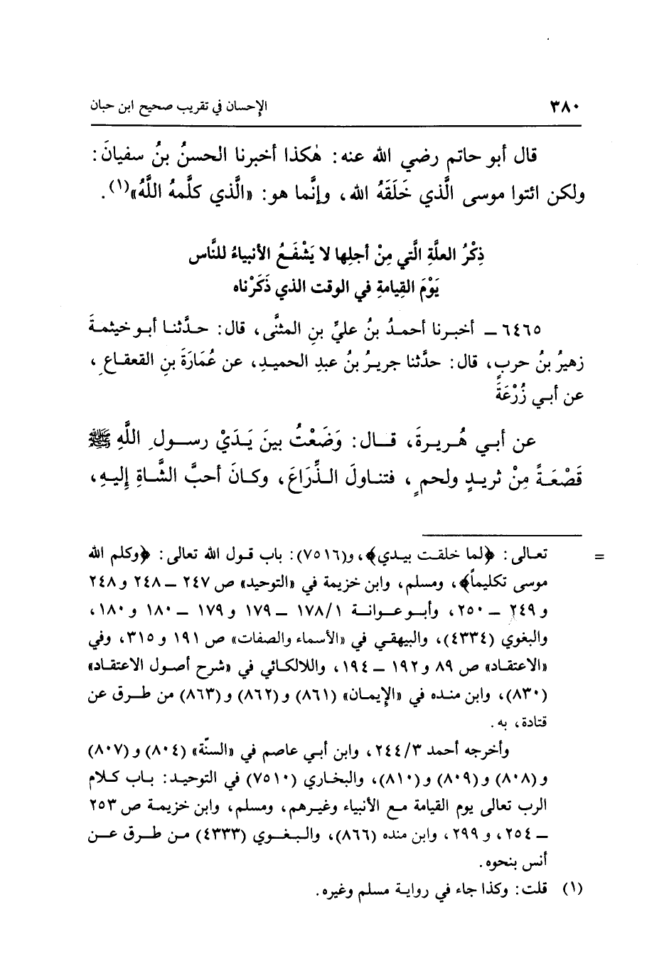 قَالَ أَبُو حَاتِمٍ رَضِيَ اللَّهُ عَنْهُ: «هَكَذَا أَخْبَرَنَا الْحَسَنُ بْنُ سُفْيَانَ، وَلَكِنِ ائْتُوا مُوسَى الَّذِي خَلْقَهُ اللَّهُ» ، وَإِنَّمَا هُوَ: «الَّذِي كَلَّمَهُ اللَّهُ» (1) .