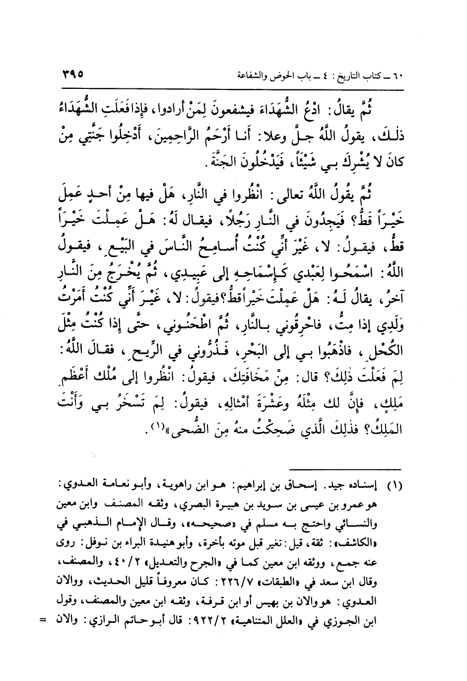 ثُمَّ يُقَالُ: ادْعُ الشُّهَدَاءَ فَيَشْفَعُونَ لِمَنْ أَرَادُوا، فَإِذَا فَعَلَتِ الشُّهَدَاءُ ذَلِكَ يَقُولُ اللَّهُ جَلَّ وَعَلَا: أَنَا أَرْحَمُ الرَّاحِمِينَ، أَدْخِلُوا جَنَّتِي مَنْ كَانَ لَا يُشْرِكُ بِي شَيْئًا، فَيَدْخُلُونَ الْجَنَّةَ، ثُمَّ يَقُولُ اللَّهُ تَعَالَى: انْظُرُوا فِي النَّارِ هَلْ فِيهَا مِنْ أَحَدٍ عَمِلَ خَيْرًا قَطُّ، فَيَجِدُونَ فِي النَّارِ رَجُلًا، فَيُقَالُ لَهُ: هَلْ عَمِلْتُ خَيْرًا قَطُّ، فَيَقُولُ: لَا غَيْرَ أَنِّي كُنْتُ أُسَامِحُ النَّاسَ فِي الْبَيْعِ، فَيَقُولُ اللَّهُ: اسْمَحُوا لِعَبْدِي كَإِسْمَاحِهِ إِلَى عَبِيدِي، ثُمَّ يَخْرُجُ مِنَ النَّارِ آخَرُ يُقَالُ لَهُ: هَلْ عَمِلْتَ خَيْرًا قَطُّ، فَيَقُولُ: لَا، غَيْرَ أَنِّي كُنْتُ أَمَرْتُ وَلَدِي، إِذَا مِتُّ فَاحْرِقُونِي فِي النَّارِ، ثُمَّ اطْحَنُونِي، حَتَّى إِذَا كُنْتُ مِثْلَ الْكُحْلِ، فَاذْهَبُوا بِي إِلَى الْبَحْرِ، فَذُرُّونِي فِي الرِّيحِ، فَقَالَ اللَّهُ: لِمَ فَعَلْتَ ذَلِكَ؟ قَالَ: مِنْ مَخَافَتِكَ، فَيَقُولُ: انْظُرُوا إِلَى مُلْكٍ أَعْظَمِ مُلْكٍ، فَإِنَّ لَكَ مِثْلَهُ وَعَشَرَةُ أَمْثَالِهِ، فَيَقُولُ: لِمَ تَسْخَرُ بِي، وَأَنْتَ الْمَلِكُ؟ فَذَلِكَ الَّذِي ضَحِكْتُ مِنْهُ مِنَ الضُّحَى» (1) .