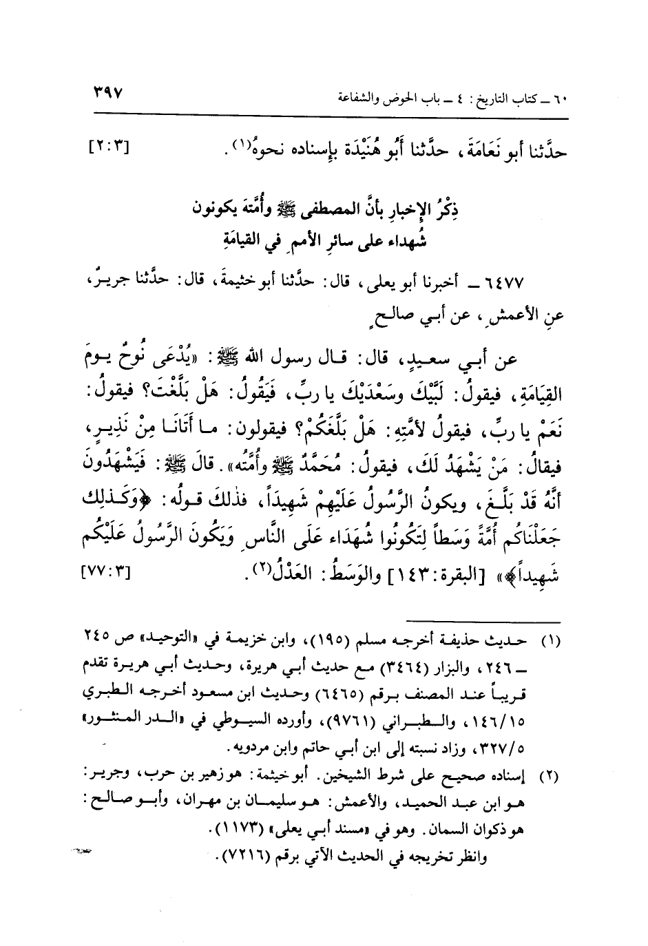 6477 - أَخْبَرَنَا أَبُو يَعْلَى، قَالَ: حَدَّثَنَا أَبُو خَيْثَمَةَ، قَالَ: حَدَّثَنَا جَرِيرٌ، عَنِ الْأَعْمَشِ، عَنْ أَبِي صَالِحٍ، عَنْ أَبِي سَعِيدٍ، قَالَ: قَالَ رَسُولُ اللَّهِ صَلَّى اللَّهُ عَلَيْهِ وَسَلَّمَ: «يُدْعَى نُوحٌ يَوْمَ الْقِيَامَةِ، فَيَقُولُ: لَبَّيْكَ وَسَعْدَيْكَ يَا رَبِّ، فَيَقُولُ: هَلْ بَلَّغْتَ؟ فَيَقُولُ: نَعَمْ يَا رَبِّ، فَيَقُولُ لِأُمَّتِهِ: هَلْ بَلَّغَكُمْ؟ فَيَقُولُونَ: مَا أَتَانَا مِنْ نَذِيرٍ، فَيُقَالُ: مَنْ يَشْهَدُ لَكَ؟ فَيَقُولُ: مُحَمَّدٌ صَلَّى اللَّهُ عَلَيْهِ وَسَلَّمَ، وَأُمَّتُهُ» قَالَ صَلَّى اللَّهُ عَلَيْهِ وَسَلَّمَ: «فَيَشْهَدُونَ أَنَّهُ قَدْ بَلَّغَ، وَيَكُونُ الرَّسُولُ عَلَيْهِمْ شَهِيدًا، فَذَلِكَ قَوْلُهُ: {وَكَذَلِكَ جَعَلْنَاكُمْ أُمَّةً وَسَطًا لِتَكُونُوا شُهَدَاءَ عَلَى النَّاسِ وَيَكُونَ الرَّسُولُ عَلَيْكُمْ شَهِيدًا} [البقرة: 143] » وَالْوَسَطُ: الْعَدْلُ (2) . [3: 77]