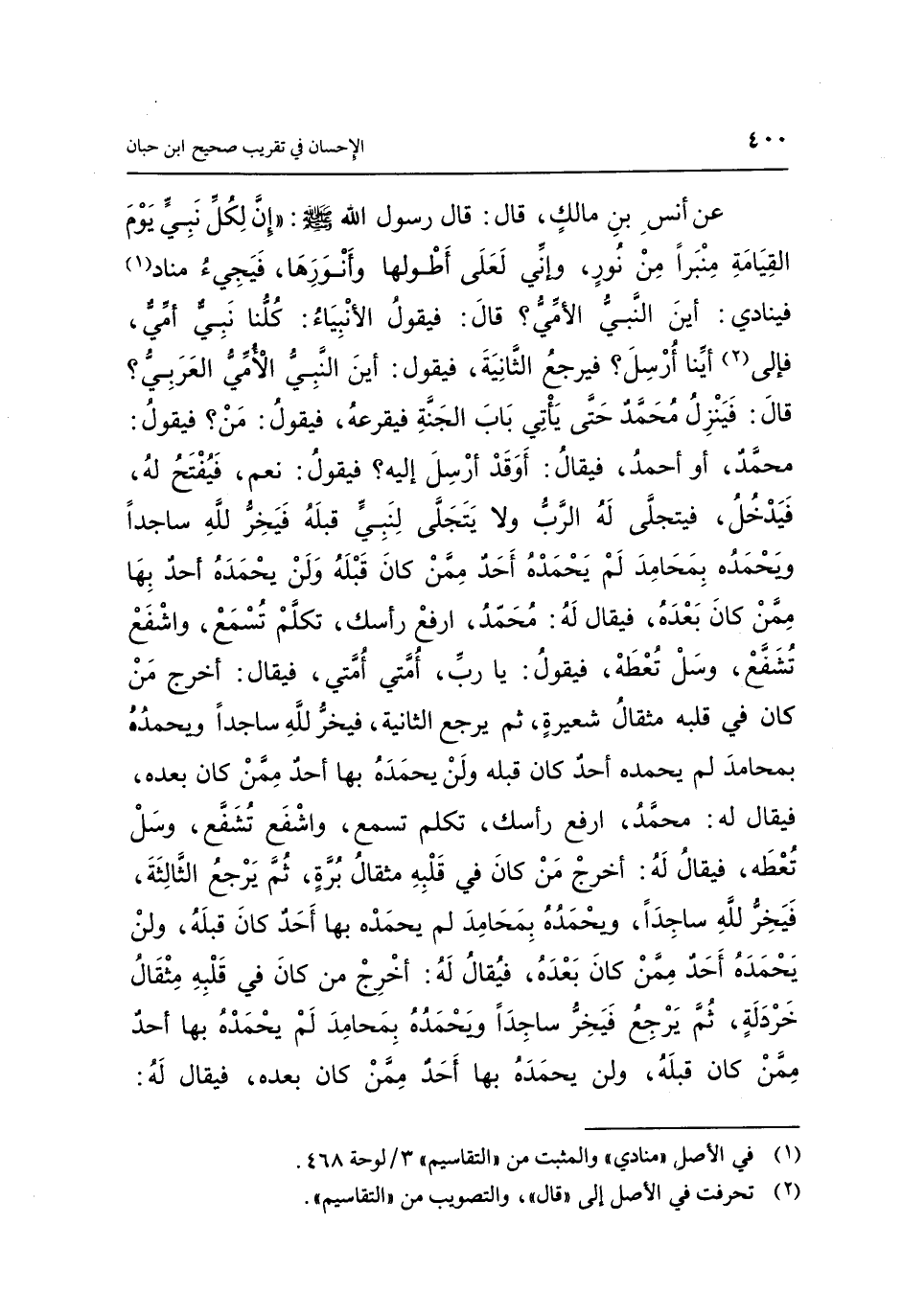 عَنْ أَنَسِ بْنِ مَالِكٍ، قَالَ: قَالَ رَسُولُ اللَّهِ صَلَّى اللَّهُ عَلَيْهِ وَسَلَّمَ: «إِنَّ لِكُلِّ نَبِيٍّ يَوْمَ الْقِيَامَةِ مِنْبَرًا مِنْ نُورٍ، وَإِنِّي لَعَلَى أَطْوَلِهَا وَأَنْوِرِهَا، فَيَجِيءُ مُنَادٍ (1) ، فَيُنَادِي: أَيْنَ النَّبِيُّ الْأُمِّيُّ؟ قَالَ: فَيَقُولُ الْأَنْبِيَاءُ: كُلُّنَا نَبِيٌّ أُمِّيٌّ، فَإِلَى (2) أَيِّنَا أُرْسِلَ؟ فَيَرْجِعُ الثَّانِيَةَ، فَيَقُولُ: أَيْنَ النَّبِيُّ الْأُمِّيُّ الْعَرَبِيُّ؟ قَالَ: فَيَنْزِلُ مُحَمَّدٌ حَتَّى يَأْتِيَ بَابَ الْجَنَّةِ، فَيَقْرَعَهُ، فَيَقُولُ: مَنْ؟ فَيَقُولُ: مُحَمَّدٌ أَوْ أَحْمَدُ، فَيُقَالُ: أَوَقَدْ أُرْسِلَ إِلَيْهِ؟ فَيَقُولُ: نَعَمْ، فَيُفْتَحُ لَهُ، فَيَدْخُلُ، فَيَتَجَلَّى لَهُ الرَّبُّ، وَلَا يَتَجَلَّى لِنَبِيٍّ قَبْلَهُ، فَيَخِرُّ لِلَّهِ سَاجِدًا، وَيَحْمَدُهُ بِمَحَامِدَ لَمْ يَحْمَدْهُ أَحَدٌ مِمَّنْ كَانَ قَبْلَهُ وَلَنْ يَحْمَدَهُ أَحَدٌ بِهَا مِمَّنْ كَانَ بَعْدَهُ، فَيُقَالُ لَهُ: مُحَمَّدُ ارْفَعْ رَأْسَكَ، تَكَلَّمْ تُسْمَعْ، وَاشْفَعْ تُشَفَّعْ، وَسَلْ تُعْطَهْ، فَيَقُولُ: يَا رَبِّ، أُمَّتِي أُمَّتِي، فَيُقَالُ: أَخْرِجْ مَنْ كَانَ فِي قَلْبِهِ مِثْقَالُ شَعِيرَةٍ، ثُمَّ يَرْجِعُ الثَّانِيَةَ فَيَخِرُّ لِلَّهِ سَاجِدًا وَيَحْمَدُهُ بِمَحَامِدَ لَمْ يَحْمَدْهُ أَحَدٌ كَانَ قَبْلَهُ، وَلَنْ يَحْمَدَهُ بِهَا أَحَدٌ مِمَّنْ كَانَ بَعْدَهُ، فَيُقَالُ لَهُ: مُحَمَّدُ ارْفَعْ رَأْسَكَ، تَكَلَّمْ تُسْمَعْ، وَاشْفَعْ تُشَفَّعْ، وَسَلْ تُعْطَهْ، فَيُقَالُ لَهُ: أَخْرِجْ مَنْ كَانَ فِي قَلْبِهِ مِثْقَالُ بُرَّةٍ، ثُمَّ يَرْجِعُ الثَّالِثَةَ، فَيَخِرُّ لِلَّهِ سَاجِدًا، وَيَحْمَدُهُ بِمَحَامِدَ لَمْ يَحْمَدْهُ بِهَا أَحَدٌ كَانَ قَبْلَهُ، وَلَنْ يَحْمَدَهُ أَحَدٌ مِمَّنْ كَانَ بَعْدَهُ، فَيُقَالُ لَهُ: أَخْرِجْ مِنَ النَّارِ مَنْ كَانَ فِي قَلْبِهِ مِثْقَالُ خَرْدَلَةٍ، ثُمَّ يَرْجِعُ، فَيَخِرُّ سَاجِدًا، وَيَحْمَدُهُ بِمَحَامِدَ لَمْ يَحْمَدْهُ بِهَا أَحَدٌ مِمَّنْ كَانَ قَبْلَهُ، وَلَنْ يَحْمَدَهُ بِهَا أَحَدٌ مِمَّنْ كَانَ بَعْدَهُ، فَيُقَالُ لَهُ: