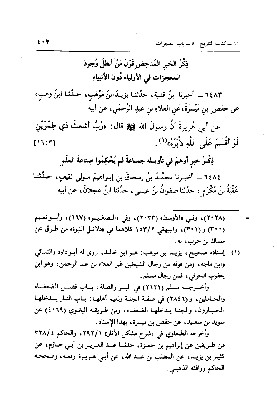 6483 - أَخْبَرَنَا ابْنُ قُتَيْبَةَ، حَدَّثَنَا يَزِيدُ بْنُ مَوْهَبٍ، حَدَّثَنَا ابْنُ وَهْبٍ، عَنْ حَفْصِ بْنِ مَيْسَرَةَ، عَنِ الْعَلَاءِ بْنِ عَبْدِ الرَّحْمَنِ، عَنْ أَبِيهِ، عَنْ أَبِي هُرَيْرَةَ، أَنَّ رَسُولَ اللَّهِ صَلَّى اللَّهُ عَلَيْهِ وَسَلَّمَ قَالَ: «رُبَّ أَشْعَثَ ذِي طِمْرَيْنِ لَوْ أَقْسَمَ عَلَى اللَّهِ لَأَبَرَّهُ» (1) . [3: 16]