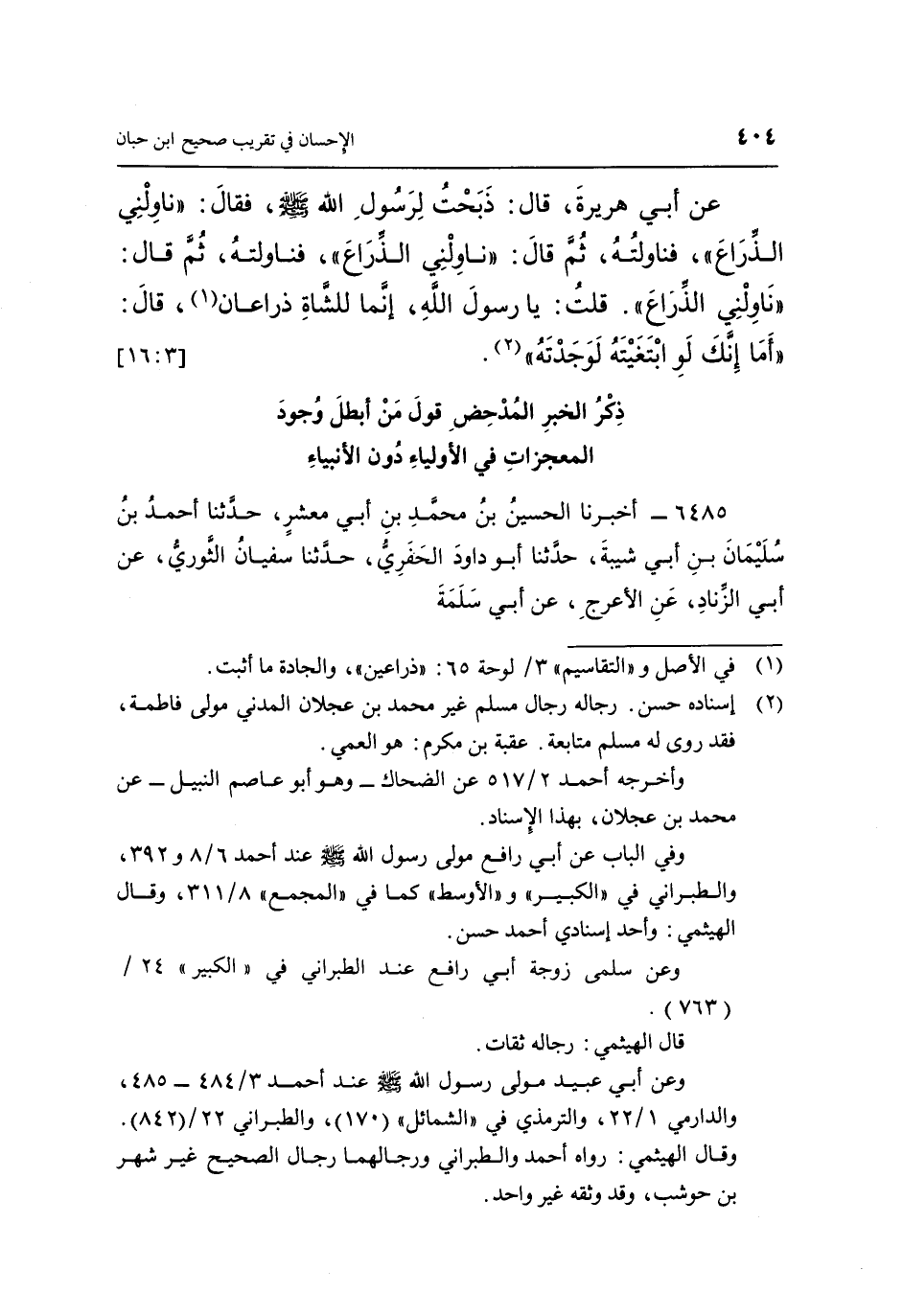 عَنْ أَبِي هُرَيْرَةَ، قَالَ: ذَبَحْتُ لِرَسُولِ اللَّهِ صَلَّى اللَّهُ عَلَيْهِ وَسَلَّمَ، فَقَالَ: «نَاوِلْنِي الذِّرَاعَ» ، فَنَاوَلْتُهُ، ثُمَّ قَالَ: «نَاوِلْنِي الذِّرَاعَ» ، فَنَاوَلْتُهُ، ثُمَّ قَالَ: «نَاوِلْنِي الذِّرَاعَ» ، قُلْتُ: يَا رَسُولَ اللَّهِ، إِنَّمَا لِلشَّاةِ ذِرَاعَانِ (1) قَالَ: «أَمَا إِنَّكَ لَوِ ابْتَغَيْتَهُ لَوَجَدْتَهُ» (2) . [3: 16]