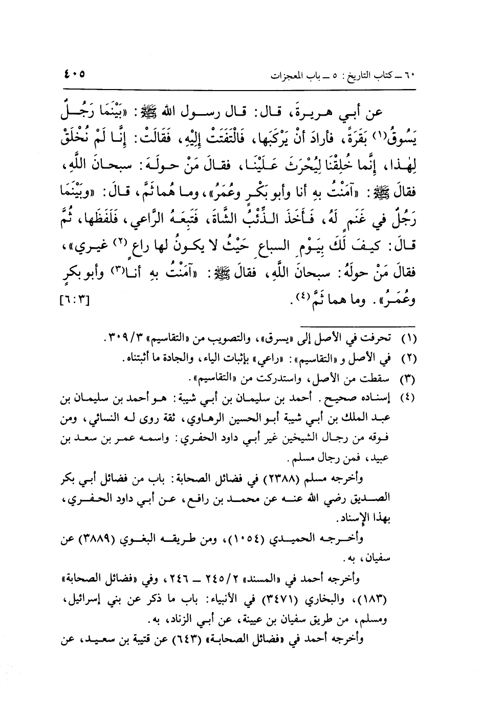 عَنْ أَبِي هُرَيْرَةَ، قَالَ: قَالَ رَسُولُ اللَّهِ صَلَّى اللَّهُ عَلَيْهِ وَسَلَّمَ: «بَيْنَمَا رَجُلٌ (1) يَسُوقُ بَقَرَةً، فَأَرَادَ أَنْ يَرْكَبَهَا، فَالْتَفَتَتْ إِلَيْهِ، فَقَالَتْ: إِنَّا لَمْ نُخْلَقْ لِهَذَا إِنَّمَا خُلِقْنَا لِيُحْرَثَ عَلَيْنَا، فَقَالَ مَنْ حَوْلَهُ: سُبْحَانَ اللَّهِ، فَقَالَ صَلَّى اللَّهُ عَلَيْهِ وَسَلَّمَ: «آمَنْتُ بِهِ أَنَا وَأَبُو بَكْرٍ، وَعُمَرُ» ، وَمَا هُمَا ثَمَّ، قَالَ: «وَبَيْنَمَا رَجُلٌ فِي غَنَمٍ لَهُ فَأَخَذَ الذِّئْبُ الشَّاةَ، فَتَبِعَهُ الرَّاعِي، فَلَفَظَهَا، ثُمَّ قَالَ: كَيْفَ لَكَ بِيَوْمِ السِّبَاعِ حَيْثُ لَا يَكُونُ لَهَا رَاعٍ (2) غَيْرِي» ، فَقَالَ مَنْ حَوْلَهُ: سُبْحَانَ اللَّهِ، فَقَالَ صَلَّى اللَّهُ عَلَيْهِ وَسَلَّمَ:» آمَنْتُ بِهِ أَنَا (3) وَأَبُو بَكْرٍ، وَعُمَرُ «، وَمَا هُمَا ثَمّ (4) . [3: 6]