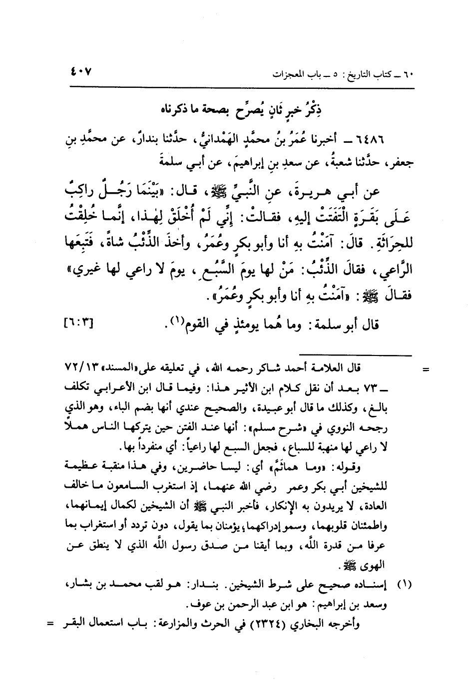 6486 - أَخْبَرَنَا عُمَرُ بْنُ مُحَمَّدٍ الْهَمْدَانِيُّ، حَدَّثَنَا بُنْدَارٌ، عَنْ مُحَمَّدِ بْنِ جَعْفَرٍ، حَدَّثَنَا شُعْبَةُ، عَنْ سَعْدِ بْنِ إِبْرَاهِيمَ، عَنْ أَبِي سَلَمَةَ، عَنْ أَبِي هُرَيْرَةَ، عَنِ النَّبِيِّ صَلَّى اللَّهُ عَلَيْهِ وَسَلَّمَ، قَالَ: «بَيْنَمَا رَجُلٌ رَاكِبٌ عَلَى بَقَرَةٍ، الْتَفَتَتْ إِلَيْهِ، فَقَالَتْ: إِنِّي لَمْ أُخْلَقْ لِهَذَا إِنَّمَا خُلِقْتُ لِلْحِرَاثَةِ» ، قَالَ: «آمَنْتُ بِهِ أَنَا وَأَبُو بَكْرٍ، وَعُمَرُ، وَأَخَذَ الذِّئْبُ شَاةً، فَتَبِعَهَا الرَّاعِي، فَقَالَ الذِّئْبُ: مَنْ لَهَا يَوْمَ السَّبْعِ، يَوْمَ لَا رَاعِيَ لَهَا غَيْرِي» ، فَقَالَ: صَلَّى اللَّهُ عَلَيْهِ وَسَلَّمَ: «آمَنْتُ بِهِ أَنَا وَأَبُو بَكْرٍ، وَعُمَرُ»