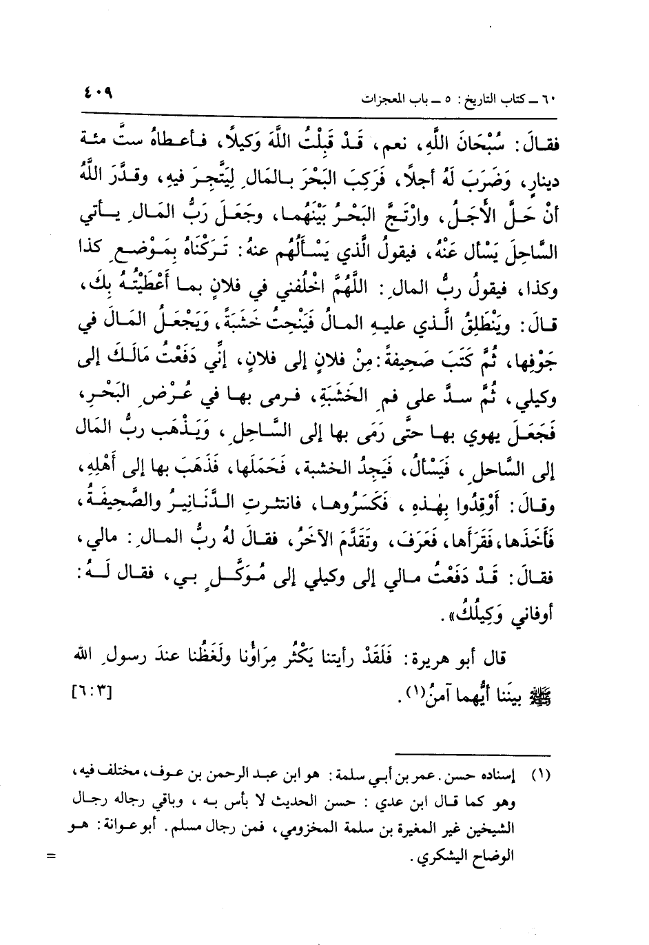 فَقَالَ: سُبْحَانَ اللَّهِ، نَعَمْ، قَدْ قَبِلْتُ اللَّهَ وَكِيلًا، فَأَعْطَاهُ سِتَّ مِائَةِ دِينَارٍ، وَضَرَبَ لَهُ أَجَلًا، فَرَكِبَ الْبَحْرَ بِالْمَالِ لِيَتَّجِرَ فِيهِ، وَقَدَّرَ اللَّهُ أَنْ حَلَّ الْأَجَلُ، وَارْتَجَّ الْبَحْرُ بَيْنَهُمَا، وَجَعَلَ رَبُّ الْمَالِ يَأْتِي السَّاحِلَ يَسْأَلُ عَنْهُ، فَيَقُولُ الَّذِي يَسْأَلُهُمْ عَنْهُ: تَرَكْنَاهُ بِمَوْضِعِ كَذَا وَكَذَا، فَيَقُولُ رَبُّ الْمَالِ: اللَّهُمَّ اخْلُفْنِي فِي فُلَانٍ بِمَا أَعْطَيْتُهُ بِكَ، قَالَ: وَيَنْطَلِقُ الَّذِي عَلَيْهِ الْمَالُ، فَيَنْحَتُ خَشَبَةً، وَيَجْعَلُ الْمَالَ فِي جَوْفِهَا، ثُمَّ كَتَبَ صَحِيفَةً مِنْ فُلَانٍ إِلَى فُلَانٍ، إِنِّي دَفَعْتُ مَالَكَ إِلَى وَكِيلِي، ثُمَّ سَدَّ عَلَى فَمِ الْخَشَبَةِ، فَرَمَى بِهَا فِي عُرْضِ الْبَحْرِ، فَجَعَلَ يَهْوِي بِهَا حَتَّى رَمَى بِهَا إِلَى السَّاحِلِ، وَيَذْهَبُ رَبُّ الْمَالِ إِلَى السَّاحِلِ، فَيَسْأَلُ، فَيَجِدُ الْخَشَبَةَ، فَحَمَلَهَا، فَذَهَبَ بِهَا إِلَى أَهْلِهِ، وَقَالَ: أَوْقِدُوا بِهَذِهِ، فَكَسَرُوهَا، فَانْتَثَرَتِ الدَّنَانِيرُ، وَالصَّحِيفَةُ، فَأَخَذَهَا، فَقَرَأَهَا، فَعَرَفَ، وَتَقَدَّمَ الْآخَرُ، فَقَالَ لَهُ رَبُّ الْمَالِ: مَالِي، فَقَالَ: قَدْ دَفَعْتُ مَالِي إِلَى وَكِيلِي، إِلَى مُوَكَّلٍ بِي، فَقَالَ لَهُ: أَوْفَانِي وَكِيلُكَ» قَالَ أَبُو هُرَيْرَةَ: «فَلَقَدْ رَأَيْتُنَا يَكْثُرُ مِرَاؤُنَا وَلَغَظُنَا عِنْدَ رَسُولِ اللَّهِ صَلَّى اللَّهُ عَلَيْهِ وَسَلَّمَ بَيْنَنَا أَيُّهُمَا آمَنُ» (1) . [3: 6]