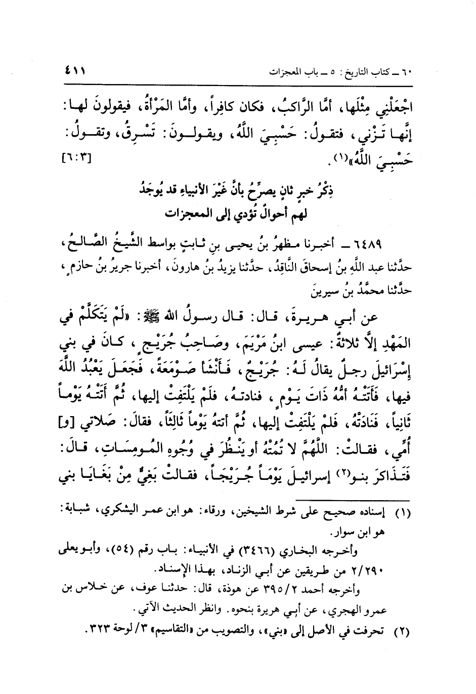 6489 - أَخْبَرَنَا مُظْهِرُ بْنُ يَحْيَى بْنِ ثَابِتٍ، بِوَاسِطَ الشَّيْخُ الصَّالِحُ، حَدَّثَنَا عَبْدُ اللَّهِ بْنُ إِسْحَاقَ النَّاقِدُ، حَدَّثَنَا يَزِيدُ بْنُ هَارُونَ، أَخْبَرَنَا جَرِيرُ بْنُ حَازِمٍ، حَدَّثَنَا مُحَمَّدُ ابْنُ سِيرِينَ، عَنْ أَبِي هُرَيْرَةَ، قَالَ: قَالَ رَسُولُ اللَّهِ صَلَّى اللَّهُ عَلَيْهِ وَسَلَّمَ: «لَمْ يَتَكَلَّمْ فِي الْمَهْدِ إِلَّا ثَلَاثَةٌ: عِيسَى ابْنُ مَرْيَمَ، وَصَاحِبُ جُرَيْجٍ كَانَ فِي بَنِي إِسْرَائِيلَ رَجُلٌ يُقَالُ لَهُ: جُرَيْجٌ، فَأَنْشَأَ صَوْمَعَةً، فَجَعَلَ يَعْبُدُ اللَّهَ فِيهَا فَأَتَتْهُ أُمُّهُ ذَاتَ يَوْمٍ، فَنَادَتْهُ، فَلَمْ يَلْتَفِتْ إِلَيْهَا، ثُمَّ أَتَتْهُ يَوْمًا ثَانِيًا فَنَادَتْهُ فَلَمْ يَلْتَفِتْ إِلَيْهَا، ثُمَّ أَتَتْهُ يَوْمًا ثَالِثًا، فَقَالَ: صَلَاتِي وَأُمِّي، فَقَالَتِ: اللَّهُمَّ لَا تُمِتْهُ أَوْ يَنْظُرَ فِي وُجُوهِ الْمُومِسَاتِ، قَالَ: فَتَذَاكَرَ بَنُو (2) إِسْرَائِيلَ يَوْمًا جُرَيْجًا، فَقَالَتْ بَغِيٌّ مِنْ بَغَايَا بَنِي