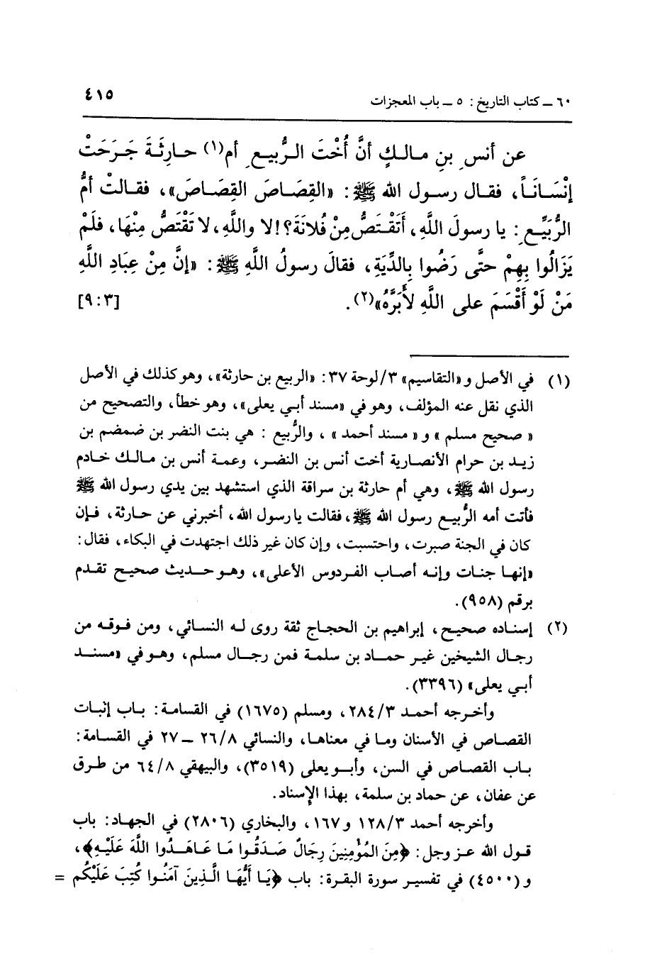 عَنْ أَنَسِ بْنِ مَالِكٍ، أَنَّ أُخْتَ الرَّبِيعِ أُمَّ (1) حَارِثَةَ، جَرَحَتْ إِنْسَانًا، فَقَالَ رَسُولُ اللَّهِ صَلَّى اللَّهُ عَلَيْهِ وَسَلَّمَ: «الْقِصَاصَ الْقِصَاصَ» ، فَقَالَتْ أُمُّ الرَّبِيعِ: يَا رَسُولَ اللَّهِ أَتَقْتَصُّ مِنْ فُلَانَةَ؟ لَا وَاللَّهِ لَا تَقْتَصُّ مِنْهَا، فَلَمْ يَزَالُوا بِهِمْ حَتَّى رَضُوا بِالدِّيَةِ، فَقَالَ رَسُولُ اللَّهِ صَلَّى اللَّهُ عَلَيْهِ وَسَلَّمَ: «إِنَّ مِنْ عِبَادِ اللَّهِ مَنْ لَوْ أَقْسَمَ عَلَى اللَّهِ لَأَبَرَّهُ» (2) . [3: 9]