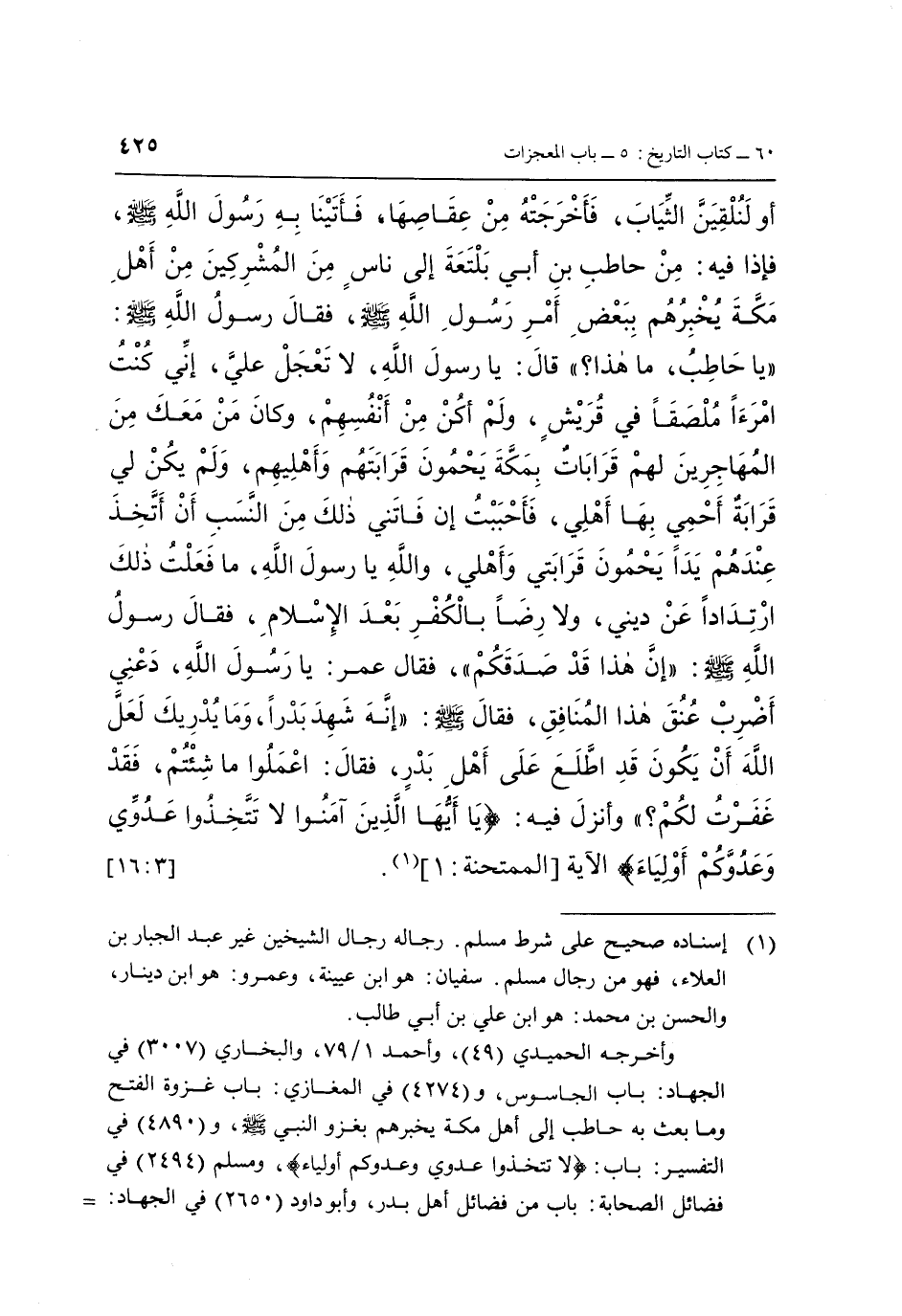 أَوْ لَنُلْقِيَنَّ الثِّيَابَ، فَأَخْرَجَتْهُ مِنْ عِقَاصِهَا، فَأَتَيْنَا بِهِ رَسُولَ اللَّهِ صَلَّى اللَّهُ عَلَيْهِ وَسَلَّمَ، فَإِذَا فِيهِ: مِنْ حَاطِبِ بْنِ أَبِي بَلْتَعَةَ إِلَى نَاسٍ مِنَ الْمُشْرِكِينَ مِنْ أَهْلِ مَكَّةَ، يُخْبِرُهُمْ بِبَعْضِ أَمْرِ رَسُولِ اللَّهِ صَلَّى اللَّهُ عَلَيْهِ وَسَلَّمَ، فَقَالَ رَسُولُ اللَّهِ صَلَّى اللَّهُ عَلَيْهِ وَسَلَّمَ: «يَا حَاطِبُ مَا هَذَا؟» ، قَالَ: يَا رَسُولَ اللَّهِ لَا تَعْجَلْ عَلَيَّ إِنِّي كُنْتُ امْرَأً مُلْصَقًا فِي قُرَيْشٍ، وَلَمْ أَكُنْ مِنْ أَنْفُسِهِمْ، وَكَانَ مَنْ مَعَكَ مِنَ الْمُهَاجِرِينِ لَهُمْ قَرَابَاتٌ بِمَكَّةَ، يَحْمُونَ قَرَابَتَهُمْ وَأَهْلِيهِمْ، وَلَمْ يَكُنْ لِي قَرَابَةٌ أَحْمِي بِهَا أَهْلِي، فَأَحْبَبْتُ إِنْ فَاتَنِي ذَلِكَ مِنَ النَّسَبِ أَنْ أَتَّخِذَ عِنْدَهُمْ يَدًا يَحْمُونَ قَرَابَتِي وَأَهْلِي، وَاللَّهِ يَا رَسُولَ اللَّهِ، مَا فَعَلْتُ ذَلِكَ ارْتِدَادًا عَنْ دِينِي، وَلَا رِضًا بِالْكُفْرِ بَعْدَ الْإِسْلَامِ، فَقَالَ رَسُولُ اللَّهِ صَلَّى اللَّهُ عَلَيْهِ وَسَلَّمَ: «إِنَّ هَذَا قَدْ صَدَقَكُمْ» ، فَقَالَ عُمَرُ: يَا رَسُولَ اللَّهِ دَعْنِي أَضْرِبْ عُنُقَ هَذَا الْمُنَافِقِ، فَقَالَ صَلَّى اللَّهُ عَلَيْهِ وَسَلَّمَ: «إِنَّهُ شَهِدَ بَدْرًا، وَمَا يُدْرِيكَ لَعَلَّ اللَّهَ أَنْ يَكُونَ قَدِ اطَّلَعَ عَلَى أَهْلِ بَدْرٍ، فَقَالَ: اعْمَلُوا مَا شِئْتُمْ فَقَدْ غَفَرْتُ لَكُمْ» ، وَأَنْزَلَ فِيهِ: {يَا أَيُّهَا الَّذِينَ آمَنُوا لَا تَتَّخِذُوا عَدُوِّي وَعَدُوَّكُمْ أَوْلِيَاءَ} الْآيَةَ [الممتحنة: 1] (1) . [3: 16]