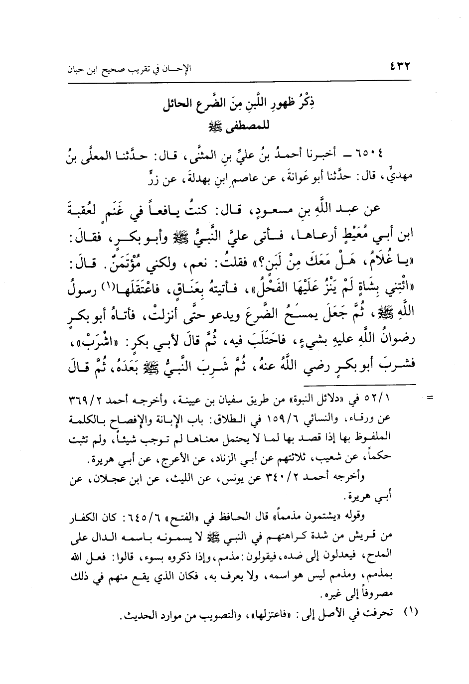 6504 - أَخْبَرَنَا أَحْمَدُ بْنُ عَلِيِّ بْنِ الْمُثَنَّى، قَالَ: حَدَّثَنَا الْمُعَلَّى بْنُ مَهْدِيٍّ، قَالَ: حَدَّثَنَا أَبُو عَوَانَةَ، عَنْ عَاصِمِ بْنِ بَهْدَلَةَ، عَنْ زِرٍّ، عَنْ عَبْدِ اللَّهِ بْنِ مَسْعُودٍ، قَالَ: كُنْتُ يَافِعًا فِي غَنَمٍ لِعُقْبَةَ بْنَ أَبِي مُعَيْطٍ أَرْعَاهَا، فَأَتَى عَلَيَّ النَّبِيُّ صَلَّى اللَّهُ عَلَيْهِ وَسَلَّمَ وَأَبُو بَكْرٍ، فَقَالَ: «يَا غُلَامُ هَلْ مَعَكَ مِنْ لَبَنٍ؟» ، فَقُلْتُ: نَعَمْ، وَلَكِنِّي مُؤْتَمَنٌ، قَالَ: «ائْتِنِي بِشَاةٍ لَمْ يَنْزُ عَلَيْهَا الْفَحْلُ» ، فَأَتَيْتُهُ بِعَنَاقٍ، فَاعْتَقَلَهَا (1) رَسُولُ اللَّهِ صَلَّى اللَّهُ عَلَيْهِ وَسَلَّمَ، ثُمَّ جَعَلَ يَمْسَحُ الضَّرْعَ، وَيَدْعُو حَتَّى أَنْزَلَتْ، فَأَتَاهُ أَبُو بَكْرٍ رِضْوَانُ اللَّهِ عَلَيْهِ بِشَيْءٍ، فَاحْتَلَبَ فِيهِ، ثُمَّ قَالَ لِأَبِي بَكْرٍ: «اشْرَبْ» ، فَشَرِبَ أَبُو بَكْرٍ رَضِيَ اللَّهُ عَنْهُ، ثُمَّ شَرِبَ النَّبِيُّ صَلَّى اللَّهُ عَلَيْهِ وَسَلَّمَ بَعْدَهُ، ثُمَّ قَال