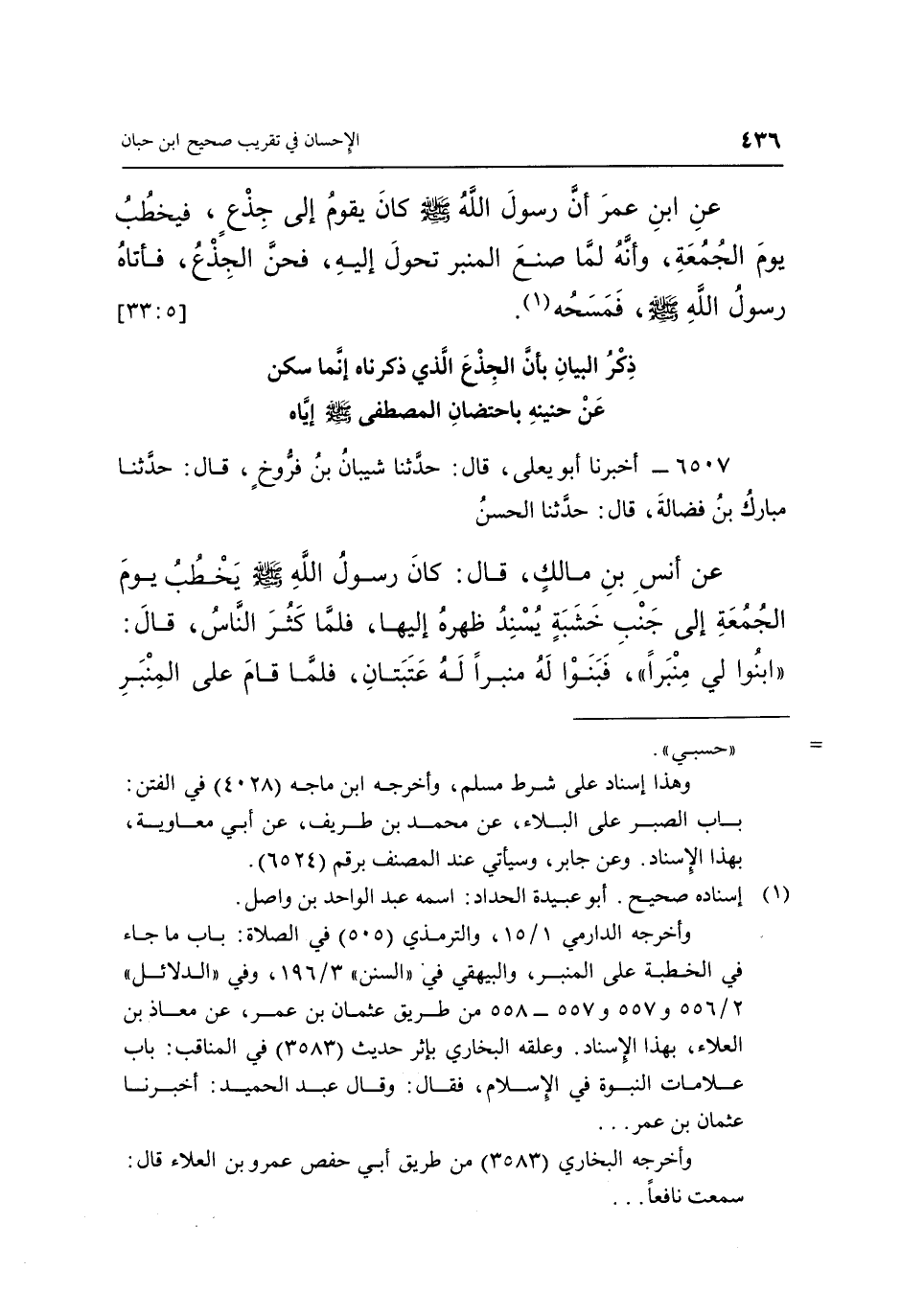 عَنِ ابْنِ عُمَرَ: «أَنَّ رَسُولَ اللَّهِ صَلَّى اللَّهُ عَلَيْهِ وَسَلَّمَ كَانَ يَقُومُ إِلَى جِذْعٍ، فَيَخْطُبُ يَوْمَ الْجُمُعَةِ، وَأَنَّهُ لَمَّا صَنَعَ الْمِنْبَرَ تَحَوَّلَ إِلَيْهِ فَحَنَّ الْجِذْعُ، فَأَتَاهُ رَسُولُ اللَّهِ صَلَّى اللَّهُ عَلَيْهِ وَسَلَّمَ، فَمَسَحَهُ» (1) . [5: 33]