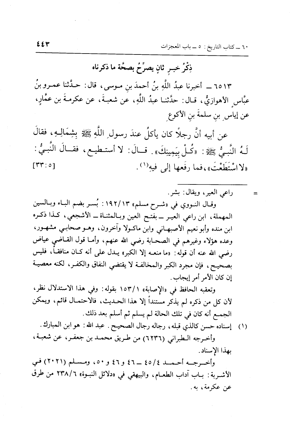 6513 - أَخْبَرَنَا عَبْدُ اللَّهِ بْنُ أَحْمَدَ بْنِ مُوسَى، قَالَ: حَدَّثَنَا عَمْرُو بْنُ عَبَّاسٍ الْأَهْوَازِيُّ، قَالَ: حَدَّثَنَا عَبْدُ اللَّهِ، عَنْ شُعْبَةَ، عَنْ عِكْرِمَةَ بْنِ عَمَّارٍ، عَنْ إِيَاسِ بْنِ سَلَمَةَ بْنِ الْأَكْوَعِ، عَنْ أَبِيهِ: أَنَّ رَجُلًا كَانَ يَأْكُلُ عِنْدَ رَسُولِ اللَّهِ صَلَّى اللَّهُ عَلَيْهِ وَسَلَّمَ بِشِمَالِهِ، فَقَالَ لَهُ النَّبِيُّ صَلَّى اللَّهُ عَلَيْهِ وَسَلَّمَ: «كُلْ بِيَمِينِكَ» قَالَ: لَا أَسْتَطِيعُ، فَقَالَ النَّبِيُّ: «لَا اسْتَطَعْتَ» ، فَمَا رَفَعَهَا إِلَى فِيهِ (1) . [5: 33]
