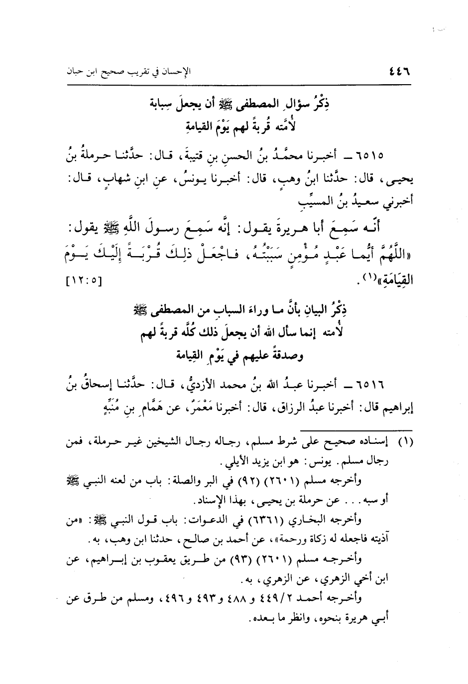 6515 - أَخْبَرَنَا مُحَمَّدُ بْنُ الْحَسَنِ بْنِ قُتَيْبَةَ، قَالَ: حَدَّثَنَا حَرْمَلَةُ بْنُ يَحْيَى، قَالَ: حَدَّثَنَا ابْنُ وَهْبٍ، قَالَ: أَخْبَرَنَا يُونُسُ، عَنِ ابْنِ شِهَابٍ، قَالَ: أَخْبَرَنِي سَعِيدُ بْنُ الْمُسَيَّبِ، أَنَّهُ سَمِعَ أَبَا هُرَيْرَةَ، يَقُولُ: إِنَّهُ سَمِعَ رَسُولَ اللَّهِ صَلَّى اللَّهُ عَلَيْهِ وَسَلَّمَ يَقُولُ: «اللَّهُمَّ أَيُّمَا عَبْدٍ مُؤْمِنٍ سَبَبْتُهُ فَاجْعَلْ ذَلِكَ قُرْبَةً إِلَيْكَ يَوْمَ الْقِيَامَةِ» (1) . [5: 12]