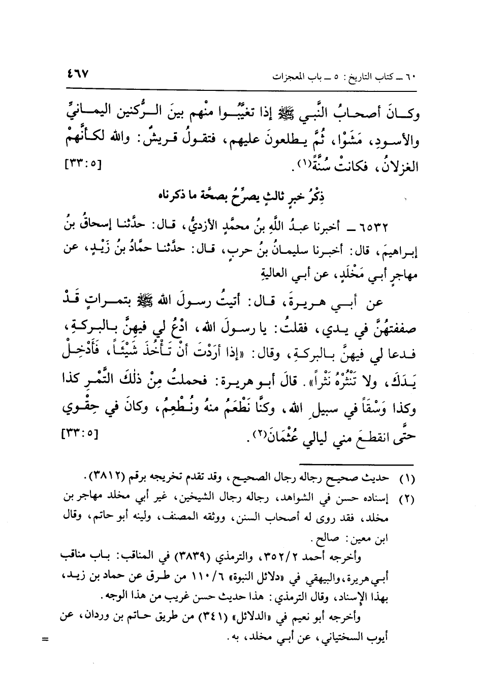 6532 - أَخْبَرَنَا عَبْدُ اللَّهِ بْنُ مُحَمَّدٍ الْأَزْدِيُّ، قَالَ: حَدَّثَنَا إِسْحَاقُ بْنُ إِبْرَاهِيمَ، قَالَ: أَخْبَرَنَا سُلَيْمَانُ بْنُ حَرْبٍ، قَالَ: حَدَّثَنَا حَمَّادُ بْنُ زَيْدٍ، عَنْ مُهَاجِرِ أَبِي مَخْلَدٍ، عَنْ أَبِي الْعَالِيَةِ، عَنْ أَبِي هُرَيْرَةَ، قَالَ: أَتَيْتُ رَسُولَ اللَّهِ صَلَّى اللَّهُ عَلَيْهِ وَسَلَّمَ بِتَمَرَاتٍ قَدْ صَفَفْتُهُنَّ فِي يَدَيَّ، فَقُلْتُ: يَا رَسُولَ اللَّهِ ادْعُ لِي فِيهِنَّ بِالْبَرَكَةِ، فَدَعَا لِي فِيهِنَّ بِالْبَرَكَةِ، وَقَالَ: «إِذَا أَرَدْتَ أَنْ تَأْخُذَ شَيْئًا فَأَدْخِلْ يَدَكَ، وَلَا تَنْثُرْهُ نَثْرًا» ، قَالَ أَبُو هُرَيْرَةَ: «فَحَمَلْتُ مِنْ ذَلِكَ التَّمْرِ كَذَا وَكَذَا وَسْقًا فِي سَبِيلِ اللَّهِ، وَكُنَّا نَطْعَمُ مِنْهُ وَنُطْعِمُ، وَكَانَ فِي حِقْوِي حَتَّى انْقَطَعَ مِنِّي لَيَالِيَ عُثْمَانَ» (2) . [5: 33]