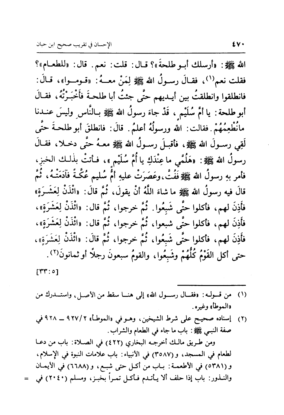 اللَّهِ صَلَّى اللَّهُ عَلَيْهِ وَسَلَّمَ: «أَرْسَلَكَ أَبُو طَلْحَةَ؟» ، قَالَ: قُلْتُ: نَعَمْ، قَالَ: «لِلطَّعَامِ؟» ، فَقُلْتُ: نَعَمْ (1) ، فَقَالَ رَسُولُ اللَّهِ صَلَّى اللَّهُ عَلَيْهِ وَسَلَّمَ لِمَنْ مَعَهُ: «قُومُوا» ، قَالَ: فَانْطَلَقُوا، وَانْطَلَقْتُ بَيْنَ أَيْدِيهِمْ حَتَّى جِئْتُ أَبَا طَلْحَةَ، فَأَخْبَرْتُهُ، فَقَالَ أَبُو طَلْحَةَ: يَا أُمَّ سُلَيْمٍ قَدْ جَاءَ رَسُولُ اللَّهِ صَلَّى اللَّهُ عَلَيْهِ وَسَلَّمَ بِالنَّاسِ، وَلَيْسَ عِنْدَنَا مَا نُطْعِمُهُمْ، فَقَالَتِ: اللَّهُ وَرَسُولُهُ أَعْلَمُ، قَالَ: فَانْطَلَقَ أَبُو طَلْحَةَ حَتَّى لَقِيَ رَسُولَ اللَّهِ صَلَّى اللَّهُ عَلَيْهِ وَسَلَّمَ، فَأَقْبَلَ رَسُولُ اللَّهِ صَلَّى اللَّهُ عَلَيْهِ وَسَلَّمَ مَعَهُ حَتَّى دَخَلَا، فَقَالَ رَسُولُ اللَّهِ صَلَّى اللَّهُ عَلَيْهِ وَسَلَّمَ: «هَلُمِّي مَا عِنْدَكِ يَا أُمَّ سُلَيْمٍ» ، فَأَتَتْ بِذَلِكَ الْخُبْزِ، فَأَمَرَ بِهِ رَسُولُ اللَّهِ صَلَّى اللَّهُ عَلَيْهِ وَسَلَّمَ فَفُتَّ، وَعَصَرَتْ عَلَيْهِ أُمُّ سُلَيْمٍ عُكَّةً فَآدَمَتْهُ، ثُمَّ قَالَ فِيهِ رَسُولُ اللَّهِ صَلَّى اللَّهُ عَلَيْهِ وَسَلَّمَ مَا شَاءَ اللَّهُ أَنْ يَقُولَ، ثُمَّ قَالَ: «ائْذَنْ لِعَشَرَةٍ» ، فَأَذِنَ لَهُمْ، فَأَكَلُوا حَتَّى شَبِعُوا، ثُمَّ خَرَجُوا، ثُمَّ قَالَ: «ائْذَنْ لِعَشَرَةٍ» ، فَأَذِنَ لَهُمْ، فَأَكَلُوا حَتَّى شَبِعُوا، ثُمَّ خَرَجُوا، ثُمَّ قَالَ: «ائْذَنْ لِعَشَرَةٍ» ، فَأَذِنَ لَهُمْ، فَأَكَلُوا حَتَّى شَبِعُوا، ثُمَّ خَرَجُوا، ثُمَّ قَالَ: «ائْذَنْ لِعَشَرَةٍ» ، حَتَّى أَكَلَ الْقَوْمُ كُلُّهُمْ وَشَبِعُوا، وَالْقَوْمُ سَبْعُونَ رَجُلًا أَوْ ثَمَانُونَ (2) . [5: 33]
