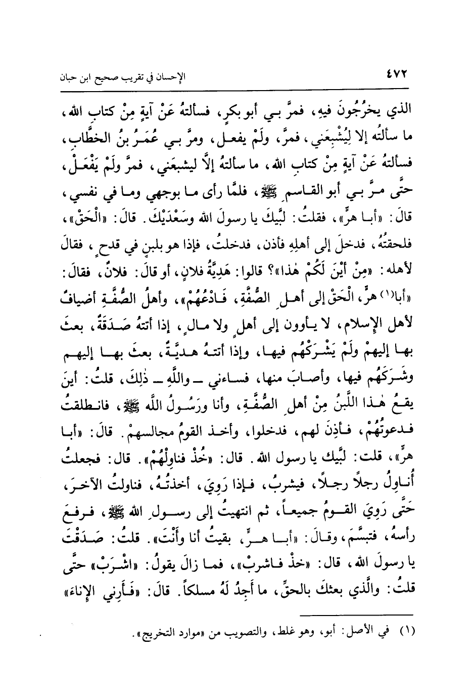 الَّذِي يَخْرُجُونَ فِيهِ، فَمَرَّ بِي أَبُو بَكْرٍ فَسَأَلْتُهُ عَنْ آيَةٍ فِي كِتَابِ اللَّهِ، مَا سَأَلْتُهُ إِلَّا لِيُشْبِعَنِي، فَمَرَّ وَلَمْ يَفْعَلْ، وَمَرَّ بِي عُمَرُ بْنُ الْخَطَّابِ فَسَأَلْتُهُ عَنْ آيَةٍ مِنْ كِتَابِ اللَّهِ، مَا سَأَلْتُهُ إِلَّا لِيُشْبِعَنِي، فَمَرَّ وَلَمْ يَفْعَلْ، حَتَّى مَرَّ بِي أَبُو الْقَاسِمِ صَلَّى اللَّهُ عَلَيْهِ وَسَلَّمَ، فَلَمَّا رَأَى مَا بِوَجْهِي، وَمَا فِي نَفْسِي، قَالَ: «أَبَا هِرٍّ» ، فَقُلْتُ: لَبَّيْكَ يَا رَسُولَ اللَّهِ، وَسَعْدَيْكَ، قَالَ: «الْحَقْ» ، فَلَحِقْتُهُ، فَدَخَلَ إِلَى أَهْلِهِ، فَأَذِنَ، فَدَخَلْتُ، فَإِذَا هُوَ بِلَبَنٍ فِي قَدَحٍ، فَقَالَ لِأَهْلِهِ: «مِنْ أَيْنَ لَكُمْ هَذَا؟» ، قَالَ: هَدِيَّةُ فُلَانٍ، أَوْ قَالَ: فُلَانٌ، فَقَالَ: «أَبَا (1) هِرٍّ الْحَقْ إِلَى أَهْلِ الصُّفَّةِ، فَادْعُهُمْ» ، وَأَهْلُ الصُّفَّةِ أَضْيَافٌ لِأَهْلِ الْإِسْلَامِ، لَا يَأْوُونَ إِلَى أَهْلٍ أَوْ مَالٍ، إِذَا أَتَتْهُ صَدَقَةٌ بَعَثَ بِهَا إِلَيْهِمْ، وَلَمْ يُشْرِكْهُمْ فِيهَا، وَإِذَا أَتَتْهُ هَدِيَّةٌ بَعَثَ بِهَا إِلَيْهِمْ وَشَرَكَهُمْ فِيهَا، وَأَصَابَ مِنْهَا، فَسَاءَنِي وَاللَّهِ ذَلِكَ، قُلْتُ: أَيْنَ يَقَعُ هَذَا اللَّبَنُ مِنْ أَهْلِ الصُّفَّةِ وَأَنَا وَرَسُولُ اللَّهِ صَلَّى اللَّهُ عَلَيْهِ وَسَلَّمَ؟، فَانْطَلَقْتُ فَدَعَوْتُهُمْ، فَأَذِنَ لَهُمْ، فَدَخَلُوا وَأَخَذَ الْقَوْمُ مَجَالِسَهُمْ، قَالَ: «أَبَا هِرٍّ» ، قُلْتُ: لَبَّيْكَ يَا رَسُولَ اللَّهِ، قَالَ: «خُذْ، فَنَاوِلْهُمْ» ، قَالَ فَجَعَلْتُ أُنَاوَلُ رَجُلًا رَجُلًا، فَيَشْرَبُ، فَإِذَا رَوِيَ أَخَذْتُهُ، فَنَاوَلْتُ الْآخَرَ حَتَّى رَوِيَ الْقَوْمُ جَمِيعًا، ثُمَّ انْتَهَيْتُ إِلَى رَسُولِ اللَّهِ صَلَّى اللَّهُ عَلَيْهِ وَسَلَّمَ فَرَفَعَ رَأْسَهُ، فَتَبَسَّمَ، وَقَالَ: «أَبَا هِرٍّ، أَنَا وَأَنْتَ» ، قُلْتُ: صَدَقْتَ يَا رَسُولَ اللَّهِ، قَالَ: «خُذْ، فَاشْرَبْ» ، فَمَا زَالَ يَقُولُ: «اشْرَبْ» ، حَتَّى قُلْتُ وَالَّذِي بَعَثَكَ بِالْحَقِّ، مَا أَجِدُ لَهُ مَسْلَكًا، قَالَ: «فَأَرِنِي الْإِنَاءَ» ،