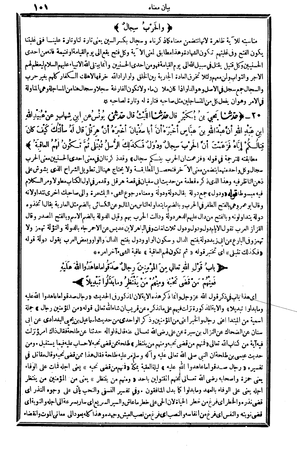 أَي: هَذَا بَاب فِي ذكر قَول الله عز وَجل، وَإِنَّمَا ذكر هَذِه الْآيَة لِأَن الْمَذْكُور فِي الحَدِيث: (رجال صدقُوا مَا عَاهَدُوا الله عَلَيْهِ وَمَا بدلُوا تبديلاً) . وَالْآيَة الْمَذْكُورَة نزلت فيهم على مَا نذكرهُ عَن قريب، إِن شَاءَ الله تَعَالَى. قَوْله: {من الْمُؤمنِينَ رجال} (الْأَحْزَاب: 32) . جملَة إسمية من الْمُبْتَدَأ، أَعنِي: رجال وَالْخَبَر أَعنِي من المؤمينين، وَذكر الواحدي من حَدِيث إِسْمَاعِيل بن يحيى الْبَغْدَادِيّ عَن أبي سِنَان عَن الضَّحَّاك عَن النزال بن سُبْرَة عَن عَليّ، رَضِي الله تَعَالَى عَنهُ، قَالَ: قَالُوا لَهُ: حَدثنَا عَن طَلْحَة، فَقَالَ: ذَاك امْرُؤ نزلت فِيهِ آيَة من كتاب الله تَعَالَى: {فَمنهمْ من قضى نحبه وَمِنْهُم من ينْتَظر} (الْأَحْزَاب: 32) . طَلْحَة مِمَّن قضى نحبه لَا حِسَاب عَلَيْهِ فِيمَا يسْتَقْبل. وَمن حَدِيث عِيسَى بن طَلْحَة: أَن النَّبِي، صلى الله عَلَيْهِ وَسلم، مر عَلَيْهِ طَلْحَة فَقَالَ: هَذَا مِمَّن قضى نحبه، وَقَالَ مقَاتل فِي تَفْسِيره: {رجال صدقُوا مَا عَاهَدُوا الله عَلَيْهِ} (الْأَحْزَاب: 32) . لَيْلَة الْعقبَة، بِمَكَّة {فَمنهمْ من قضى نحبه} (الْأَحْزَاب: 32) . يَعْنِي: أَجله فَمَاتَ على الْوَفَاء يَعْنِي: حَمْزَة وَأَصْحَابه، رَضِي الله تَعَالَى عَنْهُم، المقتولين بِأحد {وَمِنْهُم من ينْتَظر} يَعْنِي: من الْمُؤمنِينَ من ينْتَظر أَجله، يَعْنِي: على الْوَفَاء بالعهد {وَمَا بدلُوا} (الْأَحْزَاب: 32) . كَمَا بدل المُنَافِقُونَ. وَفِي (تَفْسِير النَّفْسِيّ) : والنحب يَأْتِي على وُجُوه: النّذر، أَي: قضى نَذره، والخطر إِي: فرغ من خطر الْحَيَاة، لِأَن الْحَيّ على خطر مَا عَاشَ، وَالسير السَّرِيع أَي: سَار بِسُرْعَة إِلَى أَجله، والنوبة، أَي: قضى نوبَته، و: النَّفس، أَي: فرغ من أنفاسه، وَالنّصب أَي: فرغ من نصب الْعَيْش وجهده، وَهَذَا كُله يعود إِلَى مَعَاني الْمَوْت وانقضاء