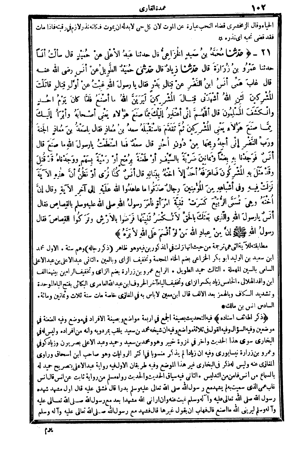 ذكر لطائف إِسْنَاده فِيهِ: التحديث بِصِيغَة الْجمع فِي أَرْبَعَة مَوَاضِع. وبصيغة الْإِفْرَاد فِي مَوضِع. وَفِيه: العنعنة فِي موضِعين. وَفِيه: السُّؤَال. وَفِيه: القَوْل فِي ثَلَاثَة مَوَاضِع، وَفِيه: أَن شَيْخه مُحَمَّد بن سعيد يلقب بمردويه وَأَنه من أَفْرَاده وَلَيْسَ لَهُ فِي البُخَارِيّ سوى هَذَا الحَدِيث وَآخر فِي غَزْوَة خَيْبَر، وَهُوَ وَمُحَمّد بن سعيد وَحميد وَعبد الْأَعْلَى بصريون، وَزِيَاد كُوفِي وَعَمْرو بن زُرَارَة نيسابوري. وَفِيه: أَن زياداً لم يذكر مَنْسُوبا فِي أَكثر الرِّوَايَات، وَهُوَ صَاحب ابْن إِسْحَاق وراوي الْمَغَازِي عَنهُ، وَلَيْسَ لَهُ ذكر فِي البُخَارِيّ غير هَذَا الْموضع. وَفِيه: طَرِيقَانِ. الأول: فِيهِ رِوَايَة عبد الْأَعْلَى: بتصريح حميد لَهُ بِالسَّمَاعِ من أنس، فأمن من التَّدْلِيس. الثَّانِي: فِيهِ سِيَاق الحَدِيث. والْحَدِيث رَوَاهُ مُسلم من رِوَايَة ثَابت عَن أنس قَالَ أنس: غَابَ عمي الَّذِي سُميت بِهِ لم يشْهد مَعَ رَسُول الله، صلى الله عَلَيْهِ وَسلم، بَدْرًا. قَالَ: فشق عَلَيْهِ، قَالَ: أول مشْهد شهده رَسُول الله، صلى الله عَلَيْهِ وَسلم، غبت عَنهُ؟ وَإِن أَرَانِي الله مشهداً بعد مَعَ رَسُول الله، صلى الله عَلَيْهِ وَسلم، ليريني الله مَا أصنع. قَالَ: فهاب أَن يَقُول غَيرهَا قَالَ: فَشهد مَعَ رَسُول الله، صلى الله عَلَيْهِ وَسلم،