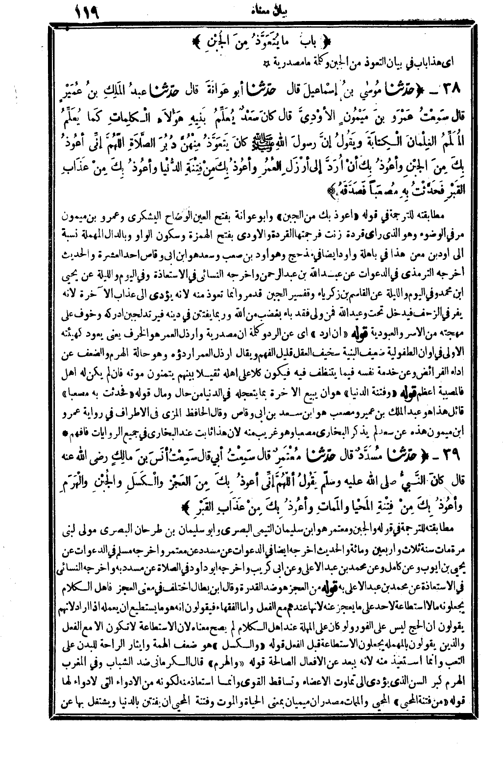 2282 - حدَّثنا مُوساى بنُ إسْمَاعِيلَ قَالَ حدَّثنا أَبُو عَوانَةَ قَالَ حدَّثنا عبدُ المَلِكِ بنُ عُمَيْرٍ قَالَ سَمِعْتُ عَمْرَو بنَ مَيْمُونٍ الأوْدِيَّ قَالَ كانَ سَعْدٌ يُعَلِّمُ بَنِيهِ هَؤلاَءِ الْكَلِمَاتِ كَما يُعَلِّمُ المُعَلِّمُ الغِلْمَانَ الْكِتَابَةَ ويَقُولُ إنَّ رَسُول الله، صلى الله عَلَيْهِ وَسلم كانَ يَتَعَوَّذُ مِنْهُنَّ دُبُرَ الصَّلاَةِ اللَّهُمَّ إنِّي أعُوذِ بِكَ مِنَ الجُبْنِ وأعُوذُ بِكَ أنْ أُرَدَّ إِلَى أرْذَلِ العُمُرِ وأعُوذِ بِكَ مِنْ فِتْنَةِ الدُّنْيَا وأعُوذِ بِكَ مِنْ عَذَابِ الْقَبْرِ فَحَدَّثْتُ بِهِ مُصْعَبَاً فَصَدَّقَهُ..