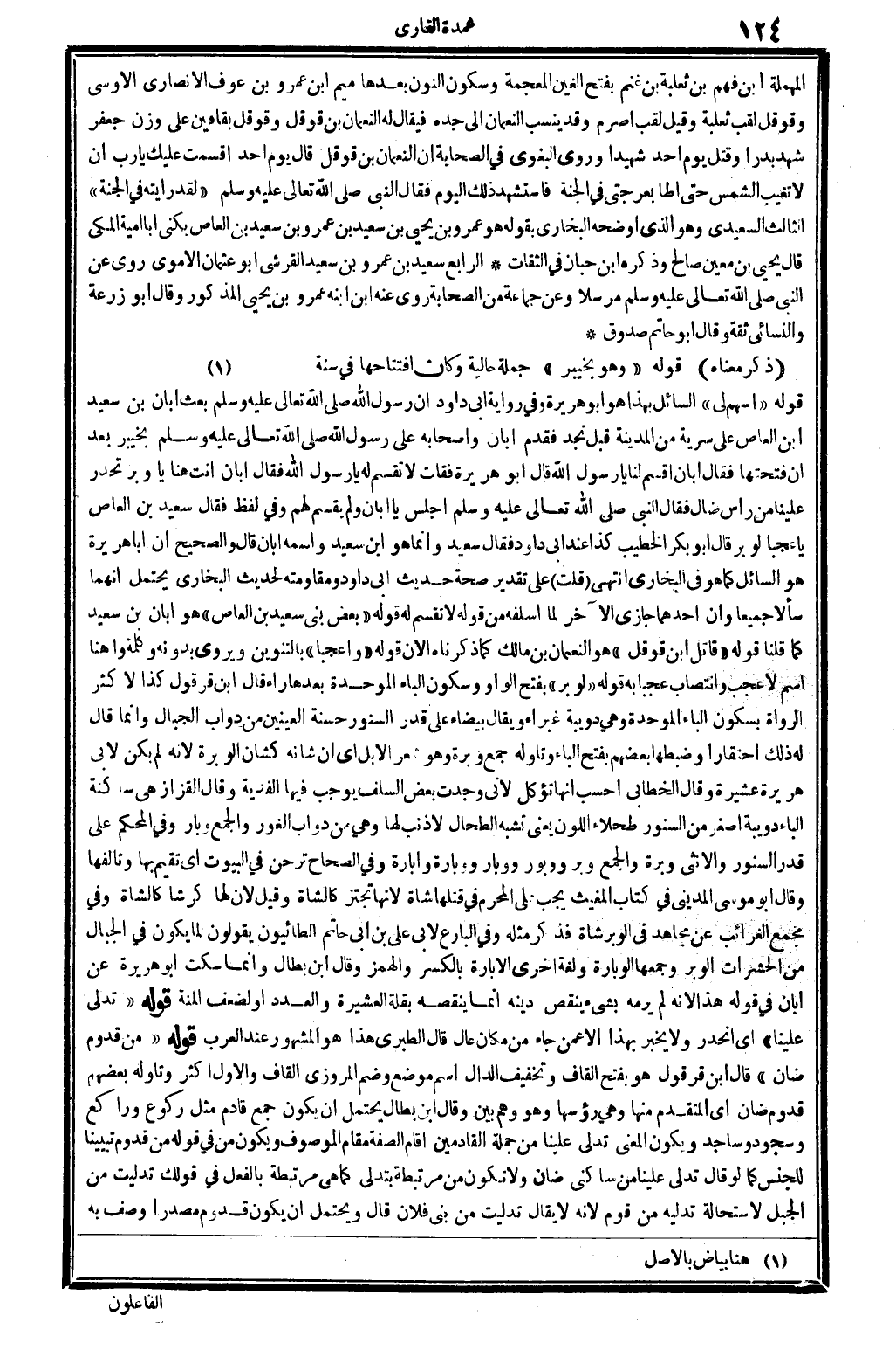 الْمُهْملَة: ابْن فهم بن ثَعْلَبَة بن غنم، بِفَتْح الْغَيْن الْمُعْجَمَة وَسُكُون النُّون بعْدهَا مِيم: ابْن عَمْرو بن عَوْف الْأنْصَارِيّ الأوسي، وقوقل لقب ثَعْلَبَة. وَقيل: لقب أَصْرَم، وَقد ينْسب النُّعْمَان إِلَى جده، فَيُقَال لَهُ: النُّعْمَان بن قوقل، وقوقل بقافين على وزن: جَعْفَر، شهد بَدْرًا وَقتل يَوْم أحد شَهِيدا، وروى الْبَغَوِيّ فِي (الصَّحَابَة) : أَن النُّعْمَان بن قوقل قَالَ يَوْم أحد: أَقْسَمت عَلَيْك يَا رب أَن لَا تغيب الشَّمْس حَتَّى أَطَأ بعرجتي فِي الْجنَّة، فاستشهد ذَلِك الْيَوْم، فَقَالَ النَّبِي، صلى الله عَلَيْهِ وَسلم: (لقد رَأَيْته فِي الْجنَّة) الثَّالِث: السعيدي، وَهُوَ الَّذِي أوضحه البُخَارِيّ بقوله: هُوَ عَمْرو بن يحيى بن سعيد بن عَمْرو بن سعيد بن الْعَاصِ، يكنى أَبَا أُميَّة الْمَكِّيّ. قَالَ يحيى بن معِين: صَالح، وَذكره ابْن حبَان فِي الثِّقَات. الرَّابِع: سعيد بن عَمْرو بن سعيد الْقرشِي أَبُو عُثْمَان الْأمَوِي، روى عَن النَّبِي، صلى الله عَلَيْهِ وَسلم، مُرْسلا، وَعَن جمَاعَة من الصَّحَابَة، روى عَنهُ ابْن ابْنه عَمْرو بن يحيى الْمَذْكُور، وَقَالَ أَبُو زرْعَة وَالنَّسَائِيّ ثِقَة، وَقَالَ أَبُو حَاتِم صَدُوق.