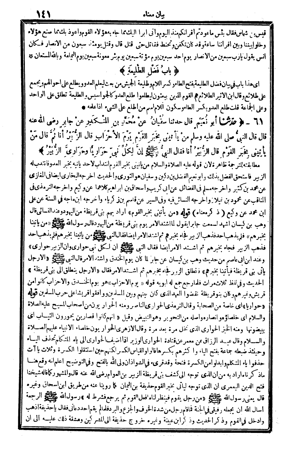 6482 - حدَّثنا أبُو نُعَيْمٍ قَالَ حدَّثنا سُفْيَانُ عنْ مُحَمَّدِ بنِ المُنْكَدِرِ عنْ جابِرٍ رَضِي الله تَعَالَى عنهُ قَالَ قَالَ النبيُّ صلى الله عَلَيْهِ وَسلم مَنْ يَأْتِينِي بِخَبَرِ القَوْمِ يَوْمَ الأحْزَابِ قَالَ الزُّبَيْرُ أَنا ثُمَّ قَالَ مَنْ يأتِينِي بِخَبَرِ القَوْمُ قَالَ الزُّبَيْرُ أنَا فَقَالَ النبيُّ صلى الله عَلَيْهِ وَسلم إنَّ لِكُلِّ نَبِيٍّ حَوَارِيَّاً وحَوَارِيَّ الزُّبَيْرُ..
