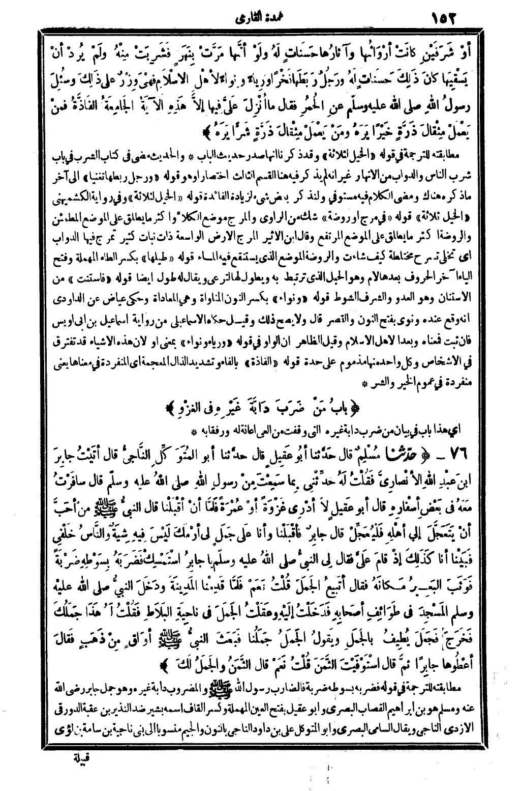 أوْ شَرَفَيْنِ كانَتْ أرْوَاثُهَا وآثَارُهَا حَسَناتٍ لَهُ ولَوْ أنَّها مَرَّتْ بِنَهْرٍ فشَرَبَتْ مِنْهُ ولمْ يُردْ أنْ يَسْقِيَهَا كانَ ذَلَكَ حَسناتٍ لَهُ ورَجُلٌ رَبَطَهَا فَخْرَاً ورِياءً ونِواءً لأهْلِ الإسْلامِ فَهْيَ وِزْرٌ على ذَلِكَ وسُئِلَ رسولُ الله صلى الله عَلَيْهِ وَسلم عنِ الحُمُرِ فَقَالَ مَا أُنْزِلَ علَيَّ فِيها إلاَّ هَذِهِ الآيَةُ الجَامِعَةُ الفَاذَّةُ {فَمَنْ يَعْمَلْ مِثْقَالِ ذَرَّةٍ خَيْرَاً يَرَهُ ومَنْ يَعْمَلُ مِثْقَالَ ذَرَّةٍ شَرَّاً يَرَهُ} (الزلزلة: 7 8) ..