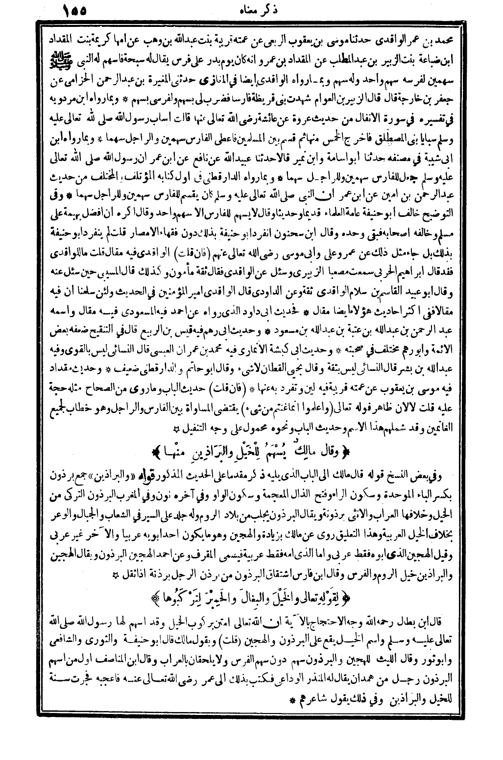 مُحَمَّد بن عمر الْوَاقِدِيّ حَدثنَا مُوسَى بن يَعْقُوب الربعِي عَن عمته قريبَة بنت عبد الله بن وهب عَن أمهَا كَرِيمَة بنت الْمِقْدَاد ابْن ضباعة بنت الزبير بن عبد الْمطلب عَن الْمِقْدَاد بن عَمْرو أَنه: كَانَ يَوْم بدر على فرس يُقَال لَهُ سبْحَة، فَأَسْهم لَهُ النَّبِي صلى الله عَلَيْهِ وَسلم سَهْمَيْنِ لفرسه سهم وَاحِد وَله سهم، وَبِمَا رَوَاهُ الْوَاقِدِيّ أَيْضا فِي الْمَغَازِي: حَدثنِي الْمُغيرَة بن عبد الرَّحْمَن الْحزَامِي عَن جَعْفَر بن خَارِجَة، قَالَ: قَالَ الزبير بن الْعَوام: شهِدت بني قُرَيْظَة فَارِسًا فَضرب لي بِسَهْم ولفرسي بِسَهْم. وَبِمَا رَوَاهُ ابْن مرْدَوَيْه فِي (تَفْسِيره) فِي سُورَة الْأَنْفَال من حَدِيث عُرْوَة عَن عَائِشَة، رَضِي الله تَعَالَى عَنْهَا، قَالَت: أساب رَسُول الله، صلى الله عَلَيْهِ وَسلم، سَبَايَا بني المصطلق، فَأخْرج الْخمس مِنْهَا ثمَّ قسم بَين الْمُسلمين، فَأعْطى الْفَارِس سَهْمَيْنِ والراجل سَهْما. وَبِمَا رَوَاهُ ابْن أبي شيبَة فِي (مُصَنفه) : حَدثنَا أَبُو أُسَامَة وَابْن نمير، قَالَا: حَدثنَا عبيد الله عَن نَافِع عَن ابْن عمر: أَن رَسُول الله، صلى الله عَلَيْهِ وَسلم، جعل للفارس سَهْمَيْنِ وللراجل سَهْما. وَبِمَا رَوَاهُ الدَّارَقُطْنِيّ فِي أول كِتَابه (المؤتلف والمختلف) من حَدِيث عبد الرَّحْمَن بن أَمِين عَن ابْن عمر: أَن النَّبِي صلى الله عَلَيْهِ وَسلم، كَانَ يقسم للفارس سَهْمَيْنِ وللراجل سَهْما. وَفِي (التَّوْضِيح) : خَالف أَبُو حنيفَة عَامَّة الْعلمَاء قَدِيما وحديثاً، وَقَالَ: لَا يُسهم للفارس إلاَّ سهم وَاحِد، وَقَالَ: أكره أَن أفضل بَهِيمَة على مُسلم، وَخَالفهُ أَصْحَابه فَبَقيَ وَحده، وَقَالَ ابْن سَحْنُون: انْفَرد أَبُو حنيفَة بذلك دون فُقَهَاء الْأَمْصَار. قلت: لم ينْفَرد أَبُو حنيفَة بذلك، بل جَاءَ مثل ذَلِك عَن عمر وَعلي وَأبي مُوسَى، رَضِي الله تَعَالَى عَنْهُم. فَإِن قلت: الْوَاقِدِيّ فِيهِ مقَال. قلت: مَا لِلْوَاقِدِي؟ فقد قَالَ إِبْرَاهِيم الْحَرْبِيّ: سَمِعت مصعباً الزبيرِي، وَسُئِلَ عَن الْوَاقِدِيّ، فَقَالَ: ثِقَة مَأْمُون، وَكَذَلِكَ قَالَ الْمسَيبِي حِين سُئِلَ عَنهُ، وَقَالَ أَبُو عبيد الْقَاسِم بن سَلام الْوَاقِدِيّ ثِقَة، وَعَن الدَّاودِيّ، قَالَ: الْوَاقِدِيّ أَمِير الْمُؤمنِينَ فِي الحَدِيث، وَلَئِن سلمنَا أَن فِيهِ مقَالا فَفِي أَكثر أَحَادِيث هَؤُلَاءِ أَيْضا مقَال. فَحَدِيث أبي دَاوُد الَّذِي رَوَاهُ عَن أَحْمد فِيهِ المَسْعُودِيّ فِيهِ مقَال، واسْمه عبد الرَّحْمَن بن عبد الله بن عتبَة بن عبد الله بن مَسْعُود. وَحَدِيث أبي رهم فِيهِ قيس بن الرّبيع، قَالَ فِي (التَّنْقِيح) : ضعفه بعض الْأَئِمَّة، وَأَبُو رهم مُخْتَلف فِي صحبته. وَحَدِيث أبي كَبْشَة الْأَنمَارِي فِيهِ مُحَمَّد بن عمرَان الْعَبْسِي، قَالَ النَّسَائِيّ: لَيْسَ بِالْقَوِيّ، وَفِيه عبد الله بن بشر، قَالَ النَّسَائِيّ: لَيْسَ بِثِقَة، وَقَالَ يحيى الْقطَّان: لَا شَيْء، وَقَالَ أَبُو حَاتِم وَالدَّارَقُطْنِيّ: ضَعِيف. وَحَدِيث مقداد فِيهِ مُوسَى بن يَعْقُوب عَن عمته قريبَة فِيهِ لين، وَتفرد بِهِ عَنْهَا. فَإِن قلت: حَدِيث الْبَاب وَمَا رُوِيَ من (الصِّحَاح) مثله حجَّة عَلَيْهِ. قلت: لَا، لِأَن ظَاهر قَوْله تَعَالَى: {وَاعْلَمُوا أَنما غنتم من شَيْء} (الْأَنْفَال: 14) . يَقْتَضِي الْمُسَاوَاة بَين الْفَارِس والراجل، وَهُوَ خطاب لجَمِيع الْغَانِمين، وَقد شملهم هَذَا الِاسْم، وَحَدِيث الْبَاب وَنَحْوه مَحْمُول على وَجه التَّنْفِيل.