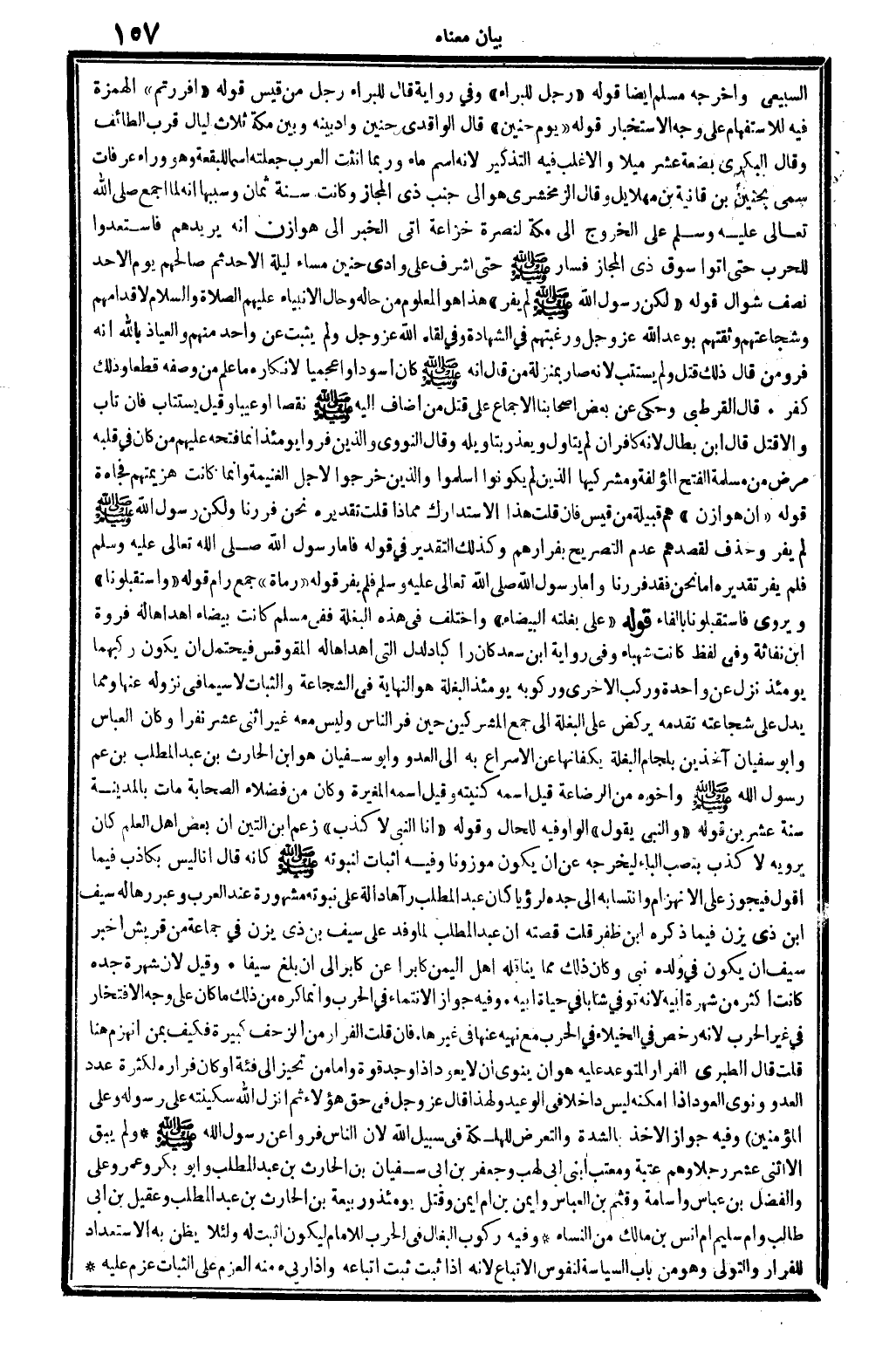 قَوْله: (رجل للبراء) وَفِي رِوَايَة قَالَ للبراء رجل من قيس. قَوْله: (أَفَرَرْتُم؟) الْهمزَة فِيهِ للاستفهام على وَجه الاستخبار. قَوْله: (يَوْم حنين) ، قَالَ الْوَاقِدِيّ: حنين وادٍ بَينه وَبَين مَكَّة ثَلَاث لَيَال قرب الطَّائِف، وَقَالَ الْبكْرِيّ: بضعَة عشر ميلًا، والأغلب فِيهِ التَّذْكِير لِأَنَّهُ اسْم مَاء، وَرُبمَا أنثت الْعَرَب جعلته إسماً للبقعة، وَهُوَ وَرَاء عَرَفَات سمي بحنين بن قانية بن مهلايل. وَقَالَ الزَّمَخْشَرِيّ: هُوَ إِلَى جنب ذِي الْمجَاز، وَكَانَت سنة ثَمَان، وسببها أَنه لما أجمع، صلى الله عَلَيْهِ وَسلم، على الْخُرُوج إِلَى مَكَّة لنصرة خُزَاعَة، أَتَى الْخَبَر إِلَى هوَازن أَنه يريدهم، فَاسْتَعدوا للحرب حَتَّى أَتَوا سوق ذِي الْمجَاز، فَسَار صلى الله عَلَيْهِ وَسلم حَتَّى أشرف على وَادي حنين مسَاء لَيْلَة الْأَحَد، ثمَّ صَالحهمْ يَوْم الْأَحَد نصف شَوَّال. قَوْله: (لَكِن رَسُول الله، صلى الله عَلَيْهِ وَسلم لم يفر) ، هَذَا هُوَ الْمَعْلُوم من حَاله وَحَال الْأَنْبِيَاء، عَلَيْهِم الصَّلَاة وَالسَّلَام، لإقدامهم وشجاعتهم وثقتهم بوعد الله، عز وَجل، ورغبتهم فِي الشَّهَادَة، وَفِي لِقَاء الله، عز وَجل، وَلم يثبت عَن وَاحِد مِنْهُم وَالْعِيَاذ بِاللَّه أَنه فر، وَمن قَالَ ذَلِك قتل وَلم يستتب لِأَنَّهُ صَار بِمَنْزِلَة من قَالَ: إِنَّه صلى الله عَلَيْهِ وَسلم كَانَ أسوداً وأعجمياً، لإنكاره مَا علم من وَصفه قطعا، وَذَلِكَ كفر. قَالَ الْقُرْطُبِيّ: وَحكي عَن بعض أَصْحَابنَا الْإِجْمَاع على قتل من أضَاف إِلَيْهِ صلى الله عَلَيْهِ وَسلم نقصا أَو عَيْبا، وَقيل: يُسْتَتَاب، فَإِن تَابَ وإلاَّ قتل. قَالَ ابْن بطال: لِأَنَّهُ كَافِر إِن لم يتَأَوَّل ويعذر بتأويله. وَقَالَ النَّوَوِيّ: وَالَّذين فروا يَوْمئِذٍ إِنَّمَا فَتحه عَلَيْهِ من كَانَ فِي قلبه مرض من مسلمة الْفَتْح الْمُؤَلّفَة ومشركيها الَّذين لم يَكُونُوا أَسْلمُوا، وَالَّذين خَرجُوا الْأَجَل الْغَنِيمَة، وَإِنَّمَا كَانَت هزيمتهم فجاءة. قَوْله: (إِن هوَازن) ، هم قَبيلَة من قيس، فَإِن قلت: هَذَا الِاسْتِدْرَاك مماذا؟ قلت: تَقْدِيره: نَحن فَرَرْنَا، وَلَكِن رَسُول الله، صلى الله عَلَيْهِ وَسلم لم يفر، وَحذف لقصدهم عدم التَّصْرِيح بفرارهم، وَكَذَلِكَ التَّقْدِير فِي قَوْله: فَأَما رَسُول الله، صلى الله عَلَيْهِ وَسلم، فَلم يفر، تَقْدِيره: أما نَحن فقد فَرَرْنَا، وَأما رَسُول الله، صلى الله عَلَيْهِ وَسلم، فَلم يفر. قَوْله: (رُمَاة) ، جمع رام. قَوْله: (واستقبلونا) ويروى: فاستقبلونا، بِالْفَاءِ. قَوْله: (على بغلته الْبَيْضَاء) ، وَاخْتلف فِي هَذِه البغلة، فَفِي مُسلم: كَانَت بَيْضَاء أهداها لَهُ فَرْوَة ابْن نفاثة. وَفِي لفظ: كَانَت شهباء، وَفِي رِوَايَة ابْن سعد: كَانَ رَاكِبًا دُلْدُل الَّتِي أهداها لَهُ الْمُقَوْقس، فَيحْتَمل أَن يكون ركبهما يَوْمئِذٍ، نزل عَن وَاحِدَة وَركب الْأُخْرَى، وركوبه يَوْمئِذٍ البغلة هُوَ النِّهَايَة فِي الشجَاعَة والثبات، لَا سِيمَا فِي نُزُوله عَنْهَا، وَمِمَّا يدل على شجاعته تقدمه يرْكض على البغلة إِلَى جمع الْمُشْركين حِين فر النَّاس، وَلَيْسَ مَعَه غير اثْنَي عشر نَفرا، وَكَانَ الْعَبَّاس وَأَبُو سُفْيَان آخذين بلجام البغلة يكفانها عَن الْإِسْرَاع بِهِ إِلَى الْعَدو، وَأَبُو سُفْيَان هُوَ ابْن الْحَارِث بن عبد الْمطلب ابْن عَم رَسُول الله، صلى الله عَلَيْهِ وَسلم وَأَخُوهُ من الرضَاعَة، قيل: اسْمه كنيته، وَقيل: اسْمه الْمُغيرَة، وَكَانَ من فضلاء الصَّحَابَة، مَاتَ بِالْمَدِينَةِ سنة عشْرين. قَوْله: (وَالنَّبِيّ يَقُول) ، الْوَاو فِيهِ للْحَال. وَقَوله: (أَنا النَّبِي لَا كذب) ، زعم ابْن التِّين أَن بعض أهل الْعلم كَانَ يرويهِ: لَا كذب، بِنصب الْبَاء ليخرجه عَن أَن يكون مَوْزُونا، وَفِيه إِثْبَات لنبوته صلى الله 