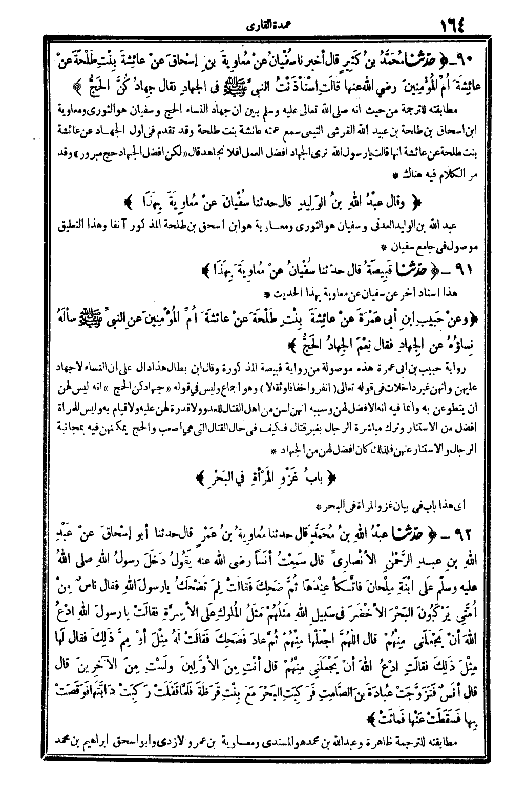 وعنْ حَبِيبِ ابنِ أبِي عَمْرَةَ عنْ عائِشَةَ بِنْتِ طَلْحَةَ عنْ عائِشَةَ أُمِّ الْمُؤْمِنِنينَ عنِ النَّبِيِّ صلى الله عَلَيْهِ وَسلم سألَهُ نِساؤُهُ عنِ الجِهَادِ فَقَالَ نِعْمَ الجِهَادُ الحَجُّ. .