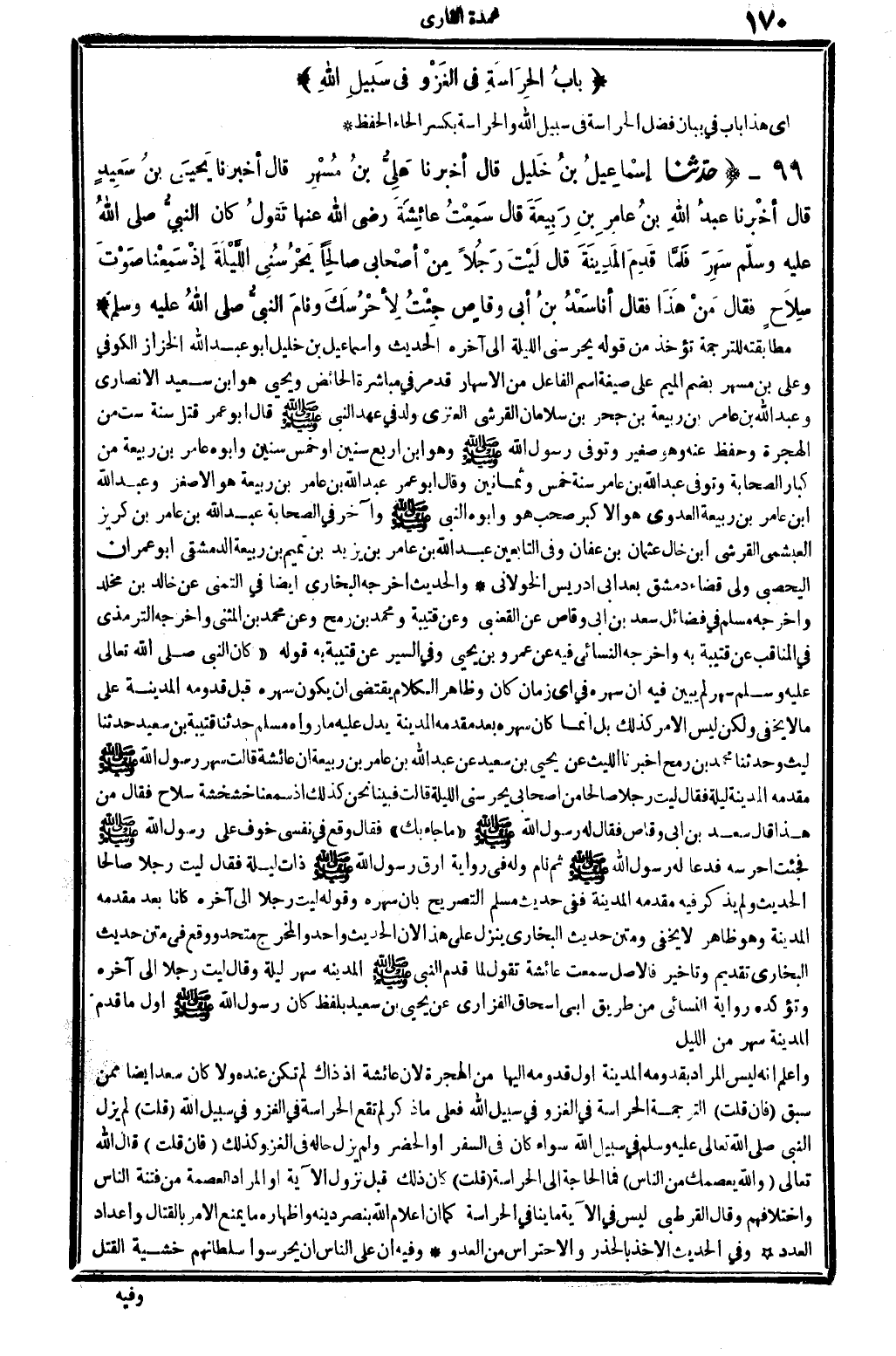 5882 - حدَّثنا إسْمَاعِيلُ بنُ خَلِيل قَالَ أخبرنَا علِيُّ بنُ مُسْهَرٍ قَالَ أخبرنَا يَحْيَى بنُ سَعِيدٍ قَالَ أخبرَنا عبدُ الله بنُ عامِرِ بنِ رَبِيعَةَ قَالَ سَمِعْتُ عائِشَةَ رَضِي الله تَعَالَى عَنْهَا تَقولُ كَانَ النَّبِيُّ صلى الله عَلَيْهِ وَسلم سَهِرَ فلَمَّا قَدِمَ الْمَدِينَةَ قَالَ لَيْتَ رَجُلاً مِنْ أصْحَابِي صالِحَاً يَحْرُسُنِي اللَّيْلَةَ إذْ سَمِعْنَا صَوْتَ سِلاَحٍ فَقالَ مَنْ هذَا فَقَالَ أَنا سَعْدُ بنُ أبِي وَقَّاصٍ جِئْتُ لأِحْرُسَكَ ونامَ النَّبِيُّ صلى الله عَلَيْهِ وَسلم.