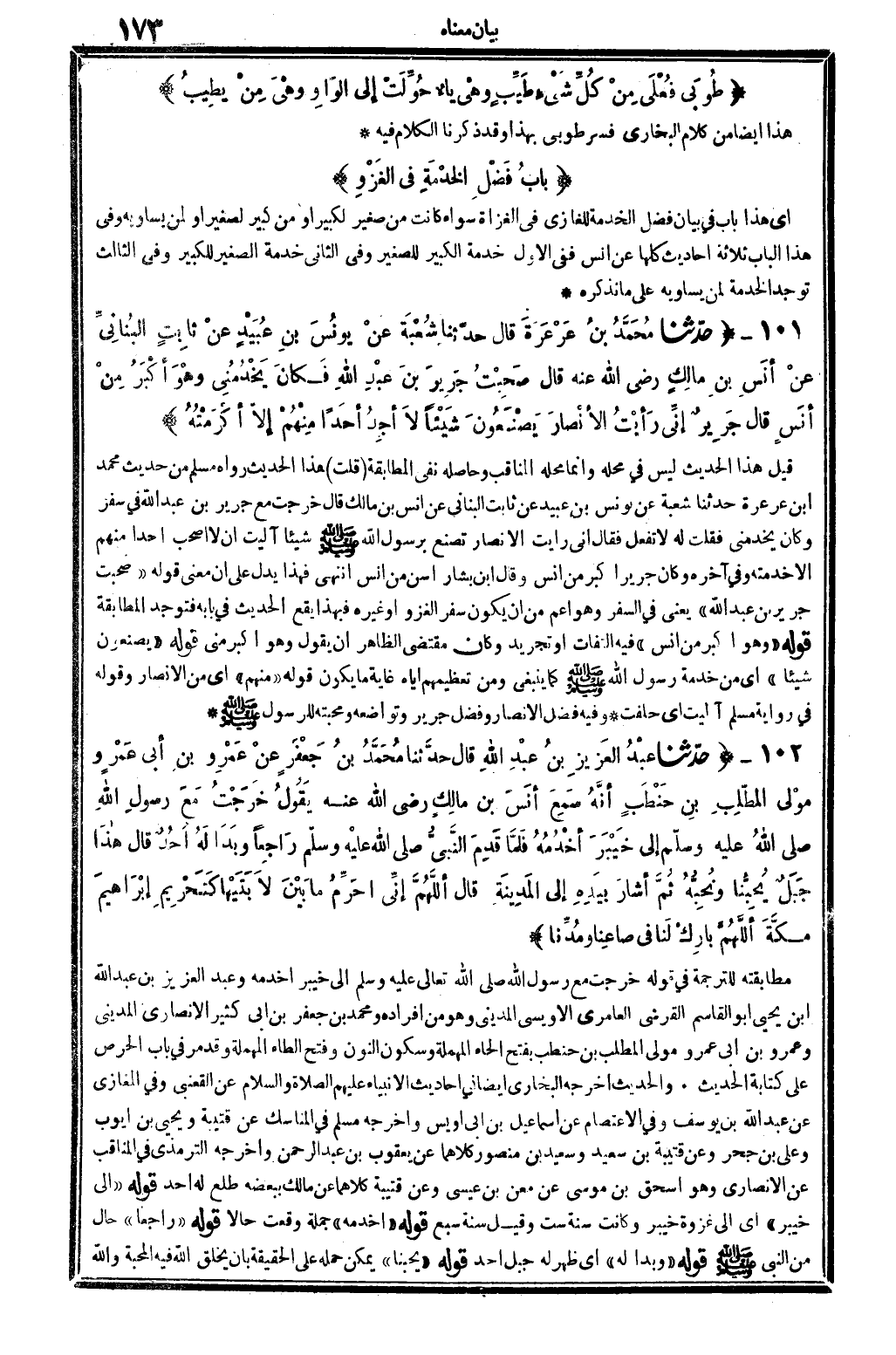 9882 - حدَّثنا عبْدُ العَزِيزِ بنُ عَبْدِ الله قَالَ حدَّثنا مُحَمَّدُ بنُ جَعْفَرٍ عنْ عَمْرِو بنِ أبِي عَمْرٍ ومَوْلى المطَّلِبِ بنِ حَنْطَبٍ أنَّهُ سَمِعَ أنَسَ بنَ مالِكٍ رَضِي الله تَعَالَى عنهُ يَقُولُ خَرَجْتُ مَعَ رَسولِ الله صلى الله عَلَيْهِ وَسلم إِلَى خَيْبَرَ أخْدُمُهُ فلَمَّا قَدِمَ النَّبِيُّ صلى الله عَلَيْهِ وَسلم رَاجِعَاً وبدَا لَهُ أُحُدٌ قَالَ هاذَا جَبَلٌ يُحِبُّنَا ونُحِبُّهُ ثُمَّ أشارَ بِيَدِهِ إلَى المَدِينَةِ قَالَ ألَّلهُمَّ إنِّي احَرِّمُ مَا بَيْنَ لاَبَتَيْهَا كَتَحْرِيمِ إبْرَاهِيمَ مَكَّةَ أللَّهُمَّ بارِكْ لَنَا فِي صاعِنا ومُدِّنَا..