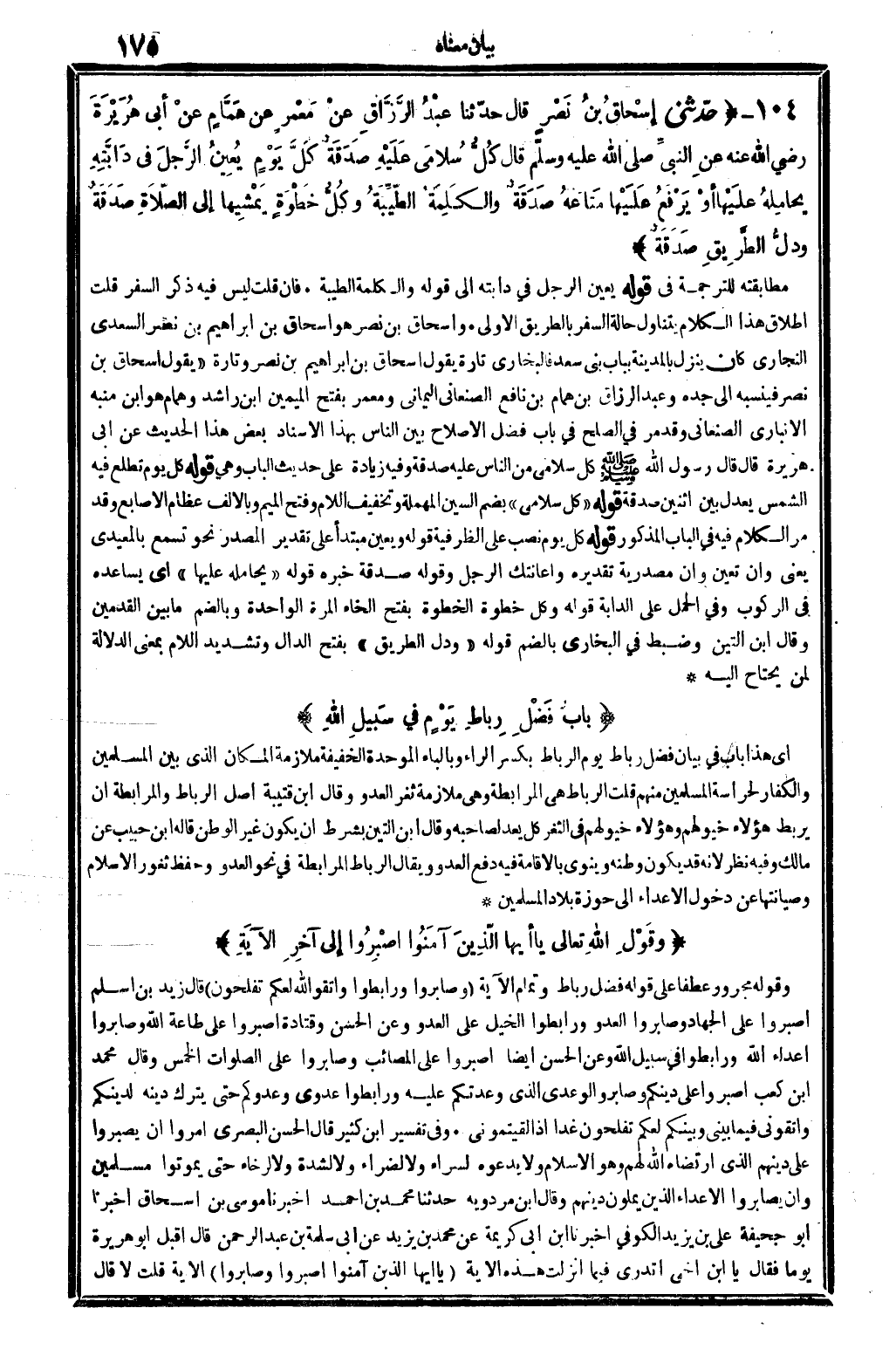 1982 - حدَّثني إسْحَاقُ بنُ نَصْرٍ قَالَ حدَّثنا عَبْدُ الرَّزَّاقِ عنْ مَعْمَرٍ عنْ هَمَّامٍ عنْ أبِي هُرَيْرَةَ رَضِي الله تَعَالَى عنهُ عنِ النَّبِيِّ صلى الله عَلَيْهِ وَسلم قَالَ كُلُّ سُلامَى عَلَيْهِ صَدَقَةٌ كُلَّ يَوْمٍ يُعِينُ الرَّجُلَ فِي دَابَّتِهِ يحامِلُهُ علَيْهَا أوْ يَرْفَعُ علَيْهَا مَتاعَهُ صَدَقَةٌ والكَلِمَةُ الطَّيِّبَةُ وكُلُّ خَطْوَةٍ يَمْشِيهَا إِلَى الصَّلاَةِ صَدَقَةٌ ودلُّ الطَّرِيقِ صَدَقَةٌ.