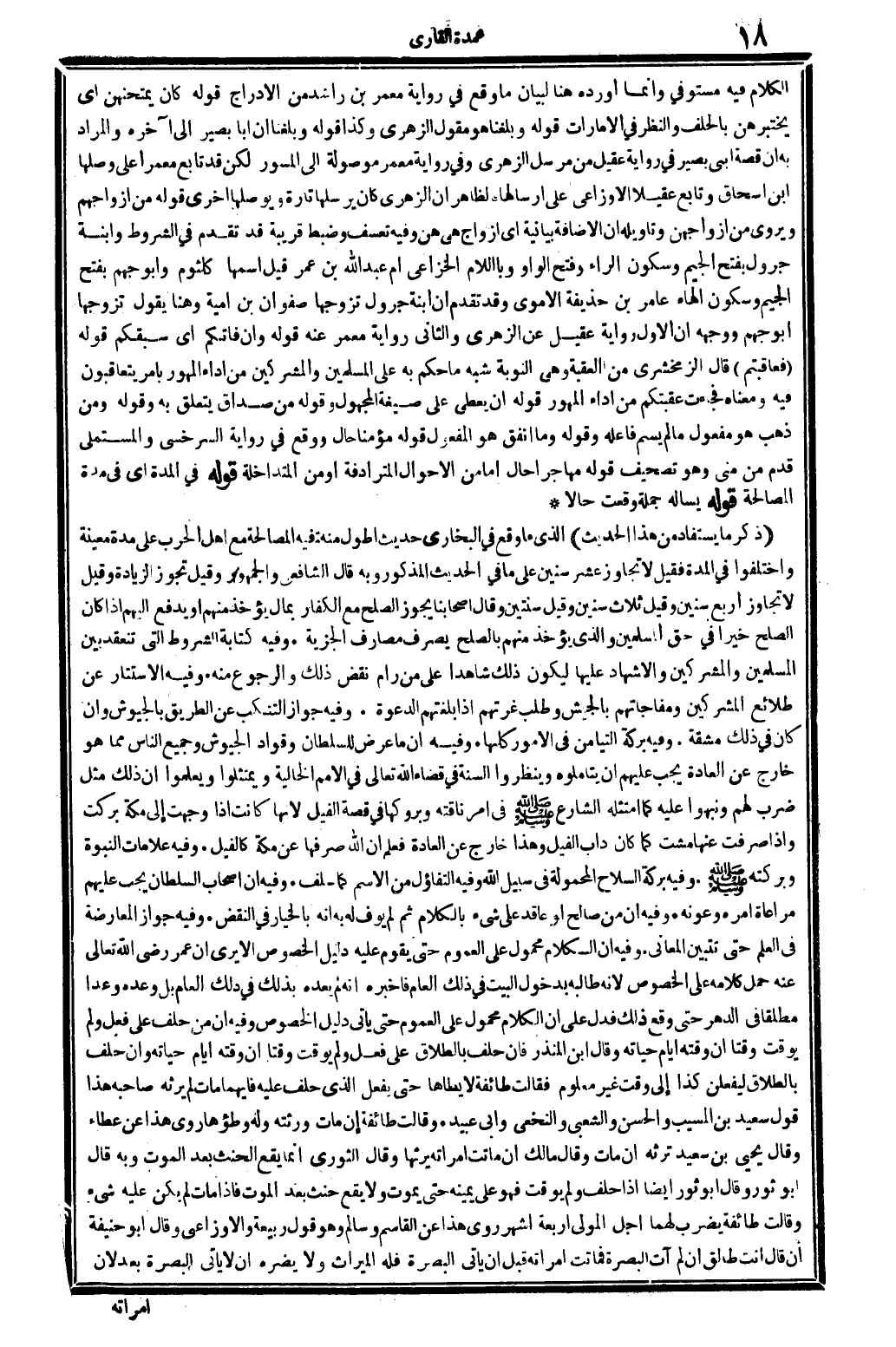 ذكر مَا يُسْتَفَاد من هَذَا الحَدِيث: الَّذِي مَا وَقع فِي البُخَارِيّ حَدِيث أطول مِنْهُ. فِيهِ: الْمُصَالحَة مَعَ أهل الْحَرْب على مُدَّة مُعينَة وَاخْتلفُوا فِي الْمدَّة. فَقيل: لَا تجَاوز عشر سِنِين، على مَا فِي الحَدِيث الْمَذْكُور، وَبِه قَالَ الشَّافِعِي وَالْجُمْهُور، وَقيل: تجوز الزِّيَادَة، وَقيل: لَا تجَاوز أَربع سِنِين، وَقيل: ثَلَاث سِنِين، وَقيل: سنتَيْن. وَقَالَ أَصْحَابنَا يجوز الصُّلْح مَعَ الْكفَّار بِمَال يُؤْخَذ مِنْهُم أَو يدْفع إِلَيْهِم إِذا كَانَ الصُّلْح خيرا فِي حق الْمُسلمين، وَالَّذِي يُؤْخَذ مِنْهُم بِالصُّلْحِ يصرف مصارف الْجِزْيَة. وَفِيه: كِتَابَة الشُّرُوط الَّتِي تَنْعَقِد بَين الْمُسلمين وَالْمُشْرِكين وَالْإِشْهَاد عَلَيْهَا ليَكُون ذَلِك شَاهدا على من رام نقض ذَلِك وَالرُّجُوع مِنْهُ. وَفِيه: الاستتار عَن طلائع الْمُشْركين ومفاجأتهم بالجيش وَطلب غرتهم إِذا بلغتهم الدعْوَة. وَفِيه: جَوَاز التنكب عَن الطَّرِيق بالجيوش، وَإِن كَانَ فِي ذَلِك مشقة. وَفِيه: بركَة التَّيَامُن فِي الْأُمُور كلهَا. وَفِيه: أَن مَا عرض للسُّلْطَان وقواد الجيوش وَجَمِيع النَّاس مِمَّا هُوَ خَارج عَن الْعَادة يجب عَلَيْهِم أَن يتأملوه وينظروا السّنة فِي قَضَاء الله تَعَالَى فِي الْأُمَم الخالية، ويمتثلوا ويعلموا أَن ذَلِك مثل ضرب لَهُم، ونبهوا عَلَيْهِ، كَمَا امتثله الشَّارِع صلى الله عَلَيْهِ وَسلم فِي أَمر نَاقَته وبروكها فِي قصَّة الْفِيل، لِأَنَّهَا كَانَت إِذا وجهت إِلَى مَكَّة بَركت، وَإِذا صرفت عَنْهَا مشت، كَمَا كَانَ دأب الْفِيل، وَهَذَا خَارج عَن الْعَادة، فَعلم أَن الله صرفهَا عَن مَكَّة كالفيل. وَفِيه: عَلَامَات النُّبُوَّة وبركته صلى الله عَلَيْهِ وَسلم. وَفِيه: بركَة السِّلَاح المحمولة فِي سَبِيل الله. وَفِيه: التفاؤل من الِاسْم كَمَا سلف. وَفِيه: أَن أَصْحَاب السُّلْطَان يجب عَلَيْهِم مُرَاعَاة أمره وعونه. وَفِيه: أَن من صَالح أَو عَاقد على شَيْء بالْكلَام ثمَّ لم يوف لَهُ بِهِ أَنه بِالْخِيَارِ فِي النَّقْض. وَفِيه: جَوَاز الْمُعَارضَة فِي الْعلم حَتَّى تتبين الْمعَانِي. وَفِيه: أَن الْكَلَام مَحْمُول على الْعُمُوم حَتَّى يقوم عَلَيْهِ دَلِيل الْخُصُوص، أَلا يرى أَن عمر، رَضِي الله تَعَالَى عَنهُ، جمل كَلَامه على الْخُصُوص، لِأَنَّهُ طَالبه بِدُخُول الْبَيْت فِي ذَلِك الْعَام، فَأخْبرهُ أَنه لم يعده بذلك فِي ذَلِك الْعَام، بل وعده وَعدا مُطلقًا فِي الدَّهْر، حَتَّى وَقع ذَلِك، فَدلَّ على أَن الْكَلَام مَحْمُول على الْعُمُوم، حَتَّى يَأْتِي دَلِيل الْخُصُوص. وَفِيه: أَن من حلف على فعل وَلم يُوَقت وقتا أَن وقته أَيَّام حَيَاته. وَقَالَ ابْن الْمُنْذر: فَإِن حلف بِالطَّلَاق على فعل وَلم يُوَقت وقتا. أَن وقته أَيَّام حَيَاته، وَإِن حلف بِالطَّلَاق ليفعلن كَذَا إِلَى وَقت غير مَعْلُوم، فَقَالَت طَائِفَة: لَا يَطَأهَا حَتَّى يفعل الَّذِي حلف عَلَيْهِ، فَأَيّهمَا مَاتَ لم يَرِثهُ صَاحبه، هَذَا قَول سعيد بن الْمسيب وَالْحسن وَالشعْبِيّ وَالنَّخَعِيّ وَأبي عبيد. وَقَالَت طَائِفَة: إِن مَاتَ ورثته وَله وَطْؤُهَا، رُوِيَ هَذَا عَن عَطاء، وَقَالَ يحيى بن سعيد: تَرثه إِن مَاتَ، وَقَالَ مَالك: إِن مَاتَت امْرَأَته يَرِثهَا. وَقَالَ الثَّوْريّ: إِنَّمَا يَقع الْحِنْث بعد الْمَوْت، وَبِه قَالَ أَبُو ثَوْر، وَقَالَ أَبُو ثَوْر أَيْضا: إِذا حلف وَلم يُوَقت فَهُوَ على يَمِينه حَتَّى يَمُوت، وَلَا يَقع حنث بعد الْمَوْت، فَإِذا مَاتَ لم يكن عَلَيْهِ شَيْء. وَقَالَت طَائِفَة: يضْرب لَهما أجل الْمولى: أَرْبَعَة أشهر، رُوِيَ هَذَا عَن الْقَاسِم وَسَالم، وَهُوَ قَول ربيعَة وَالْأَوْزَاعِيّ، وَقَالَ أَبُو حنيفَة: إِن قَالَ: أَنْت طَالِق إِن لم آتٍ الْبَصْرَة، فَمَاتَتْ امْرَأَته قبل أَن يَأْتِي الْبَصْر