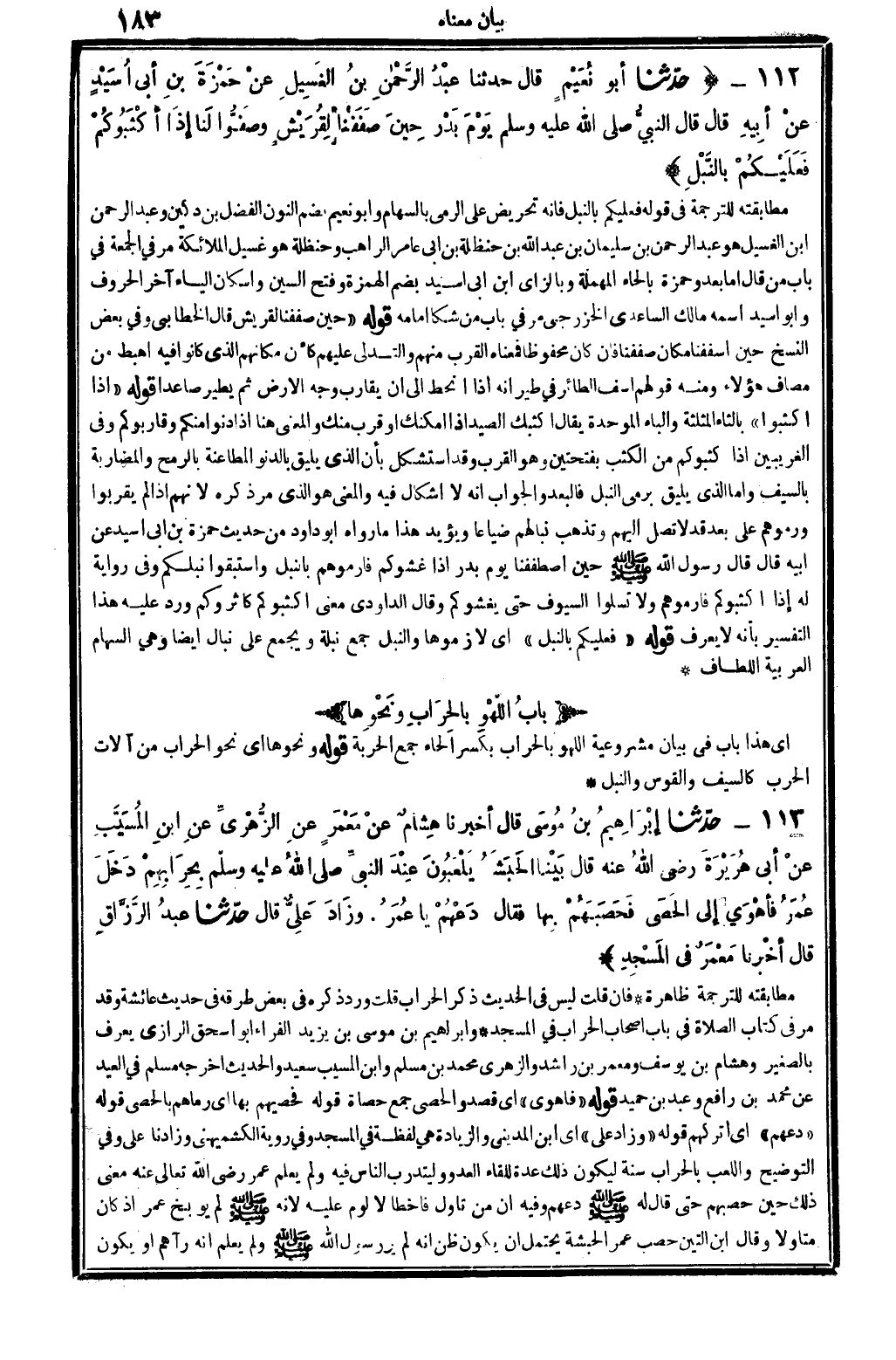 0092 - حدَّثنا أبُو نُعَيْمٍ قَالَ حدَّثنا عبْدُ الرَّحْمانِ بنُ الغَسِيلِ عنْ حَمْزَةَ بنِ أبِي أُسَيْدٍ عنْ أبِيهِ قَالَ قَالَ النَّبِيُّ صلى الله عَلَيْهِ وَسلم يَوْمَ بَدْر حِينَ صَفَفْنا لِقُرَيْشٍ وصَفُّوا لَنا إذَا أكْتَبُوكُمْ فعَلَيْكُمْ بالنَّبْلِ.