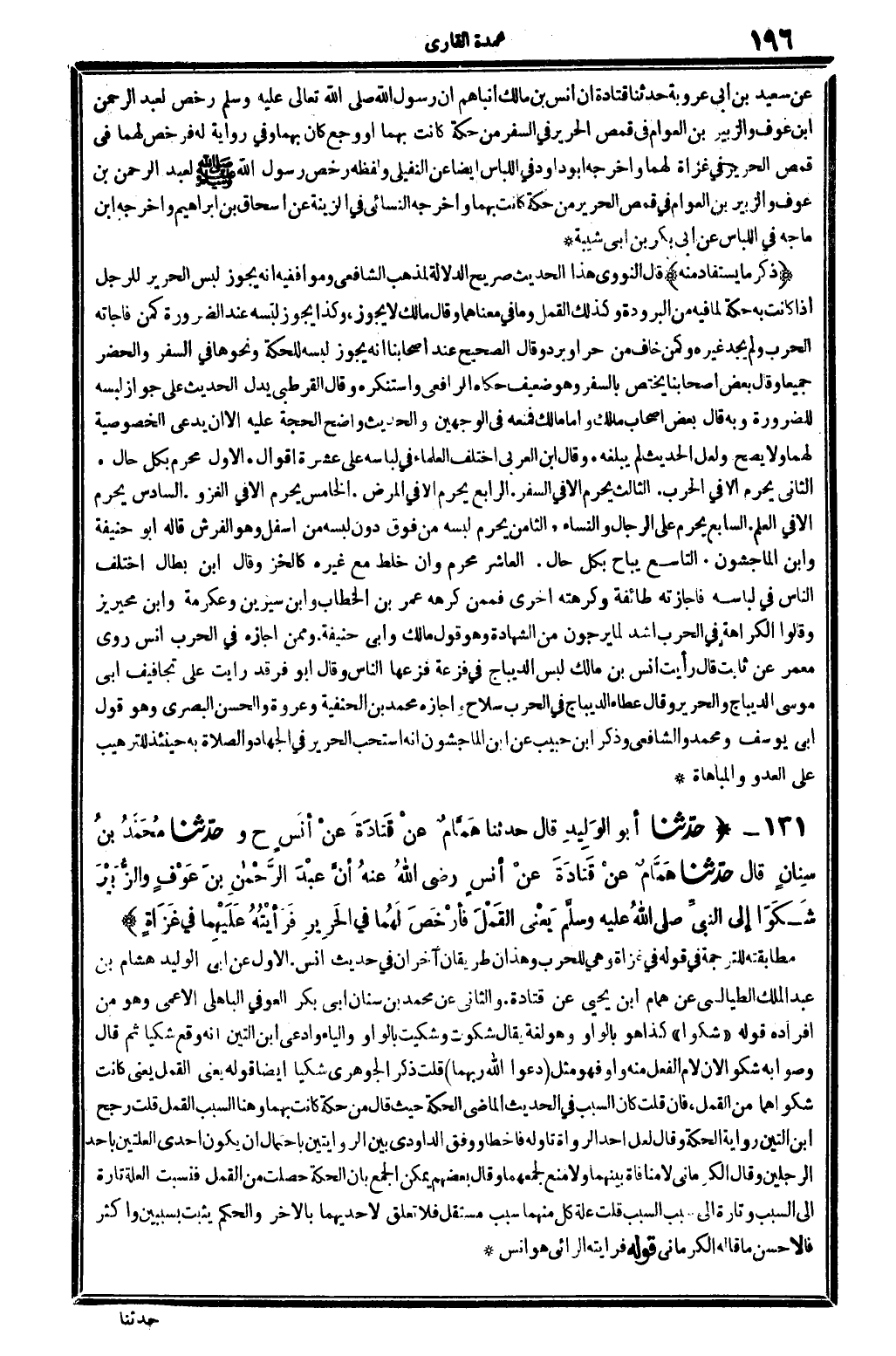0292 - حدَّثنا أبُو الْوَلِيدِ قَالَ حدَّثنا هَمَّامٌ عنْ قَتَادَةَ عنْ أنَسٍ ح وحدَّثنا مُحَمَّدُ بنُ سِنَانٍ قَالَ حدَّثنا هَمَّامٌ عنْ قَتَادَةَ عنْ أنسٍ رَضِي الله تَعَالَى عنهُ أنَّ عَبْدَ الرَّحْمانِ بنَ عَوْفٍ والزُّبَيْرَ شَكَوَا إِلَى النَّبِيِّ صلى الله عَلَيْهِ وَسلم يَعْنِي القَمْلَ فأرْخَصَ لَهُمَا فِي الحَرِيرِ فرأيْتُهُ علَيْهِمَا فِي غَزَاةِ..