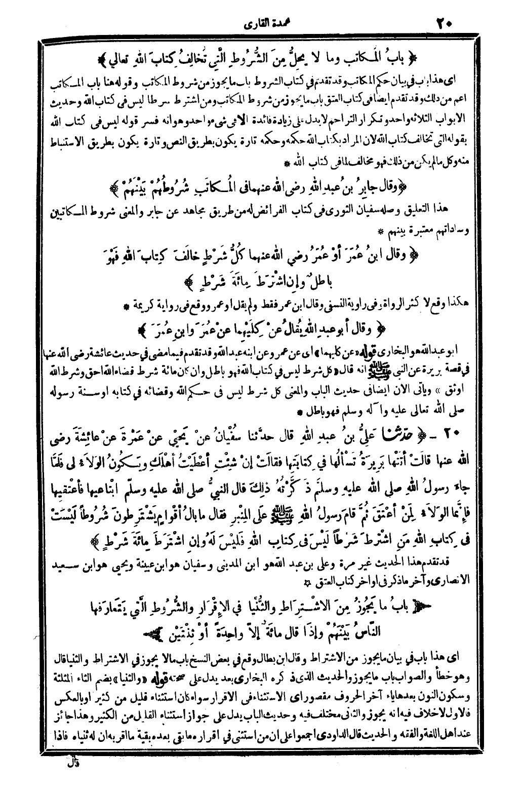 وَقَالَ ابنُ عُمَرَ أوْ عُمَرَ رَضِي الله تَعَالَى عنهُما كُلُّ شَرْطٍ خالَفَ كِتابَ الله فَهْوَ باطلٌ وإنْ اشْتَرَطَ مِائَةَ شَرْطٍ