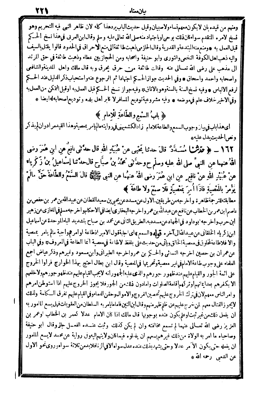 5592 - حدَّثنا مُسَدَّدٌ قالَ حَدَّثَنا يَحْيى عنْ عُبَيْدِ الله قَالَ حدَّثني نافِعٌ عنِ ابنِ عُمَرَ رَضِي الله تَعَالَى عنهُما عنِ النَّبِيِّ صلى الله عَلَيْهِ وَسلم وحدَّثني مُحَمَّدُ بنُ صبَّاحٍ قَالَ حدَّثنا إسْمَاعِيلُ بنُ زَكَرِيَّاءَ عنْ عُبَيْدِ الله عنْ نافِعٍ عنِ ابنِ عُمَرَ رَضِي الله تَعَالَى عنهُما عنِ النَّبِيِّ صلى الله عَلَيْهِ وَسلم قالَ السَّمْعُ والطَّاَعَةُ حَقٌّ مَا لَمْ يُؤْمَرْ بالْمَعْصِيَةِ فإذَا أُمِرَ بِمَعْصِيَةٍ فَلاَ سَمْعَ وَلَا طاعَةَ.