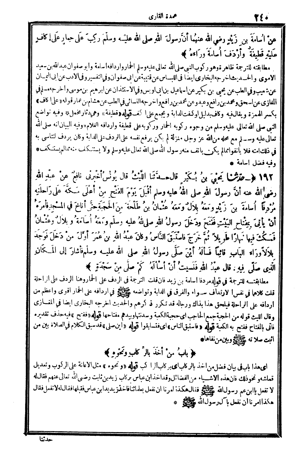 عَن أُسَامَةَ بنِ زَيْدٍ رَضِي الله تَعَالَى عنهُما أنَّ رسوُلَ الله صلى الله عَلَيْهِ وَسلم رَكِبَ علَى حِمَارٍ علَى إكَافٍ علَيْهِ قَطِيفَةٌ وأرْدَفَ أُسَامَةَ ورَاءَهُ..
