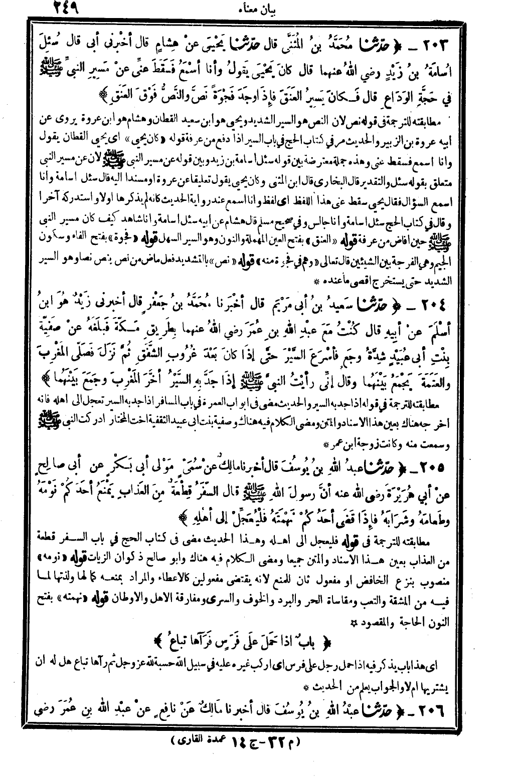 9992 - حدَّثنا مُحَمَّدُ بنُ المُثَنَّى قَالَ حدَّثنا يَحْيَى عنْ هِشَامٍ قَالَ أخْبَرَنِي أبِي قالَ سُئِلَ أُسَامَةُ بنُ زَيْدٍ رَضِي الله تَعَالَى عنهُما قَالَ كانَ يَحْيَى يَقولُ وَأَنا أسْمَعُ فسَقَطَ عَنِّي عنْ مَسِيرِ النَّبِيِّ صلى الله عَلَيْهِ وَسلم فِي حَجَّةِ الوَدَاعِ قَالَ فَكانَ يَسِيرُ العَنَقَ فإذَا وَجَدَ فَجْوَةً نَصَّ والنَّصُّ فَوْقَ العَنَقِ..
