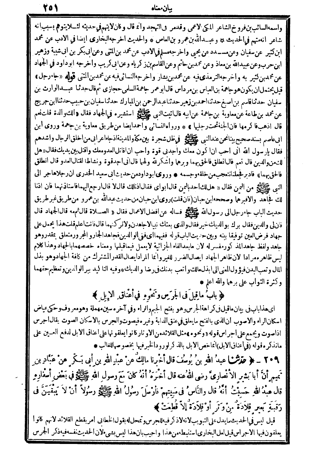 قَوْله: (جَاءَ رجل) قيل: يحْتَمل أَن يكون هُوَ جاهمة بن الْعَبَّاس بن مرداس، قَالَ أَبُو عمر: جاهمة السّلمِيّ حجازي، ثمَّ قَالَ: حَدثنَا عبد الْوَارِث بن سُفْيَان حَدثنَا قَاسم بن أصبغ حَدثنَا أَحْمد بن زُهَيْر حَدثنَا عبد الرَّحْمَن بن الْمُبَارك حَدثنَا سُفْيَان بن حبيب حَدثنَا ابْن جريج عَن مُحَمَّد بن طَاعَة عَن مُعَاوِيَة بن جاهمة عَن أَبِيه، قَالَ: أتيت النَّبِي صلى الله عَلَيْهِ وَسلم أَسْتَشِيرهُ فِي الْجِهَاد؟ فَقَالَ: (أَلَك وَالِدَة؟) قلت: نعم. قَالَ: إذهب فأكرمها فَإِن الْجنَّة تَحت رِجْلَيْهَا) . وَرَوَاهُ النَّسَائِيّ وَأحمد أَيْضا من طَرِيق مُعَاوِيَة بن جاهمة، وروى ابْن أبي عَاصِم بِسَنَد صَحِيح: بَينا نَحن عِنْد النَّبِي صلى الله عَلَيْهِ وَسلم فِي ظلّ شَجَرَة بَين مَكَّة وَالْمَدينَة إِذا جَاءَ أَعْرَابِي من أخلق الرِّجَال وأشدهم، فَقَالَ: يَا رَسُول الله {إِنِّي أحب أَن أكون مَعَك وَأَجد بِي قُوَّة، وَأحب أَن أقَاتل الْعَدو مَعَك وأقتل بَين يَديك. فَقَالَ: (هَل لَك من وَالدّين؟ قَالَ: نعم. قَالَ: إنطلق فَالْحق بهما وبرهما، واشكر لله وَلَهُمَا، قَالَ: إِنِّي أجد قُوَّة ونشاطاً لقِتَال الْعَدو، قَالَ: انْطلق فَالْحق بهما) . فَأَدْبَرَ، فَجعلنَا نتعجب من خلقه وجسمه. وروى أَبُو دَاوُد من حَدِيث أبي سعيد الْخُدْرِيّ أَن رجلا هَاجر إِلَى النَّبِي صلى الله عَلَيْهِ وَسلم من الْيمن، فَقَالَ: هَل لَك أحد بِالْيمن؟ قَالَ: أبواي، فَقَالَ: أذِنا لَك؟ قَالَ: لَا. قَالَ: إرجع إِلَيْهِمَا فاستأذنهما، فَإِن أذنا لَك فَجَاهد، وإلاَّ فبرهما) . وَصَححهُ ابْن حبَان. فَإِن قلت: روى ابْن حبَان من حَدِيث عبد الله بن عَمْرو من طَرِيق غير طَرِيق حَدِيث الْبَاب: جَاءَ رجل إِلَى رَسُول الله، صلى الله عَلَيْهِ وَسلم فَسَأَلَهُ عَن أفضل الْأَعْمَال، فَقَالَ: (الصَّلَاة، قَالَ: ثمَّ مَه؟ قَالَ: الْجِهَاد. قَالَ: فَإِن لي وَالدّين} فَقَالَ: برك بِوَالِدَيْك خير، فَقَالَ: وَالَّذِي بَعثك نَبيا لأجاهدن ولأتركنهما. قَالَ: فَأَنت أعلم) . قلت: هَذَا يحمل على جِهَاد فرض الْعين تَوْفِيقًا بَينه وَبَين حَدِيث الْبَاب. قَوْله: (ففيهما) أَي: فَفِي الْوَالِدين فَجَاهد، الْجَار وَالْمَجْرُور مُتَعَلق بمقدر، وَهُوَ: جَاهد، وَلَفظ: جَاهد الْمَذْكُور مُفَسّر لَهُ، لِأَن مَا بعد الْفَاء الجزائية لَا يعْمل فِيمَا قبلهَا، وَمَعْنَاهُ: خصصهما بِالْجِهَادِ، وَهَذَا كَلَام لَيْسَ ظَاهره مرَادا، لِأَن ظَاهر الْجِهَاد إِيصَال الضَّرَر للْغَيْر، وَإِنَّمَا المُرَاد إِيصَال الْقدر الْمُشْتَرك من كلفة الْجِهَاد، وَهُوَ بذل المَال وتعب الْبدن فيؤول الْمَعْنى إِلَى: إبذل مَالك وأتعب بدنك فِي رضَا والديك.
