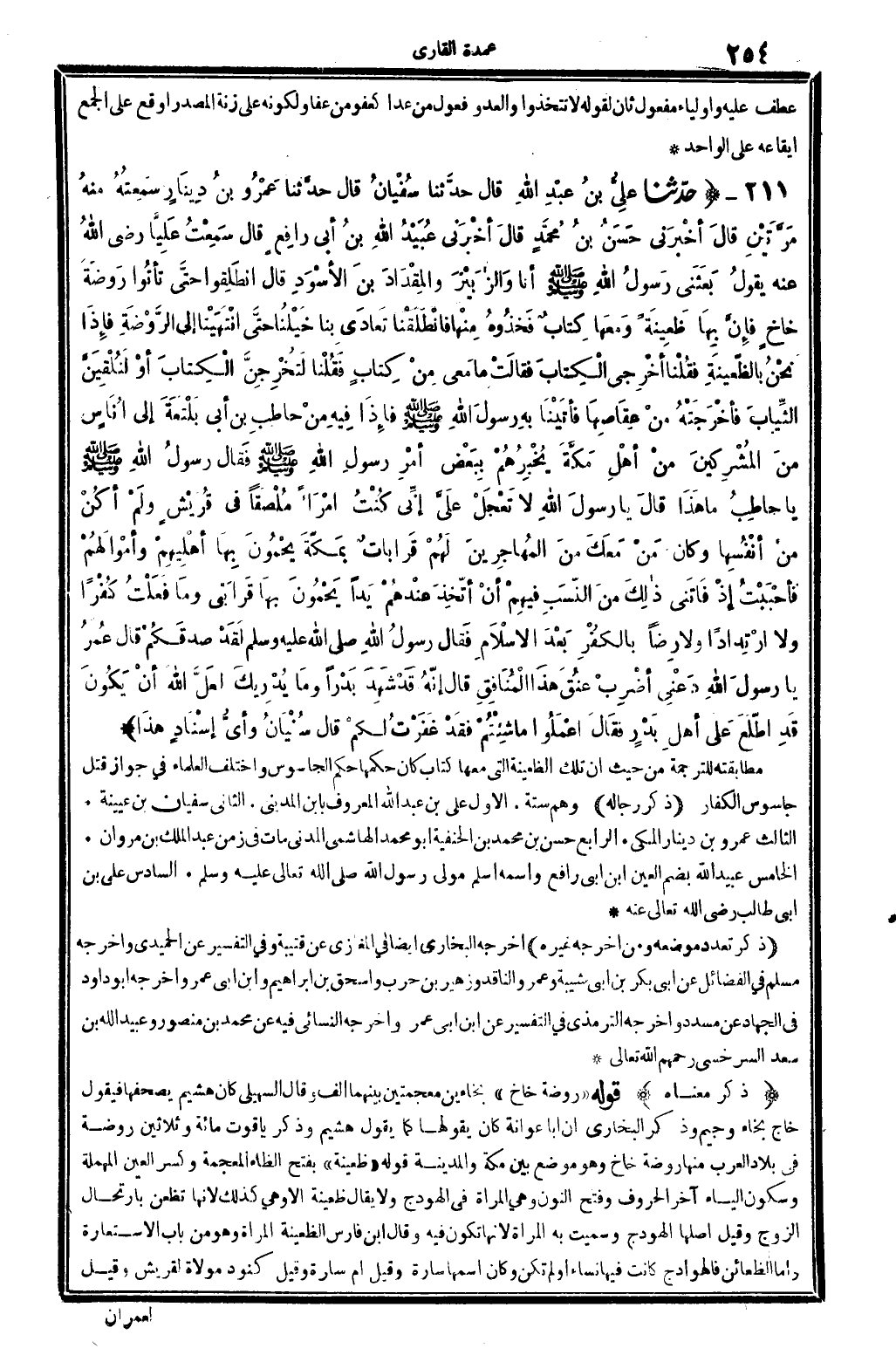 211 - (حَدثنَا عَليّ بن عبد الله قَالَ حَدثنَا سُفْيَان قَالَ حَدثنَا عَمْرو بن دِينَار سمعته مِنْهُ مرَّتَيْنِ قَالَ أَخْبرنِي حسن بن مُحَمَّد قَالَ أَخْبرنِي عبيد الله بن أبي رَافع قَالَ سَمِعت عليا رَضِي الله عَنهُ يَقُول بَعَثَنِي رَسُول الله - صَلَّى اللَّهُ عَلَيْهِ وَسَلَّم َ - أَنا وَالزُّبَيْر والمقداد بن الْأسود قَالَ انْطَلقُوا حَتَّى تَأْتُوا رَوْضَة خَاخ فَإِن بهَا ظَعِينَة وَمَعَهَا كتاب فَخُذُوهُ مِنْهَا فَانْطَلَقْنَا تعادي بِنَا خَيْلنَا حَتَّى انتهينا إِلَى الرَّوْضَة فَإِذا نَحن بِالظَّعِينَةِ فَقُلْنَا أَخْرِجِي الْكتاب فَقَالَت مَا معي من كتاب فَقُلْنَا لتخْرجن الْكتاب أَو لنلقين الثِّيَاب فَأَخْرَجته من عقاصها فأتينا بِهِ رَسُول الله - صَلَّى اللَّهُ عَلَيْهِ وَسَلَّم َ - فَإِذا فِيهِ من حَاطِب بن أبي بلتعة إِلَى أنَاس من الْمُشْركين من أهل مَكَّة يُخْبِرهُمْ بِبَعْض أَمر رَسُول الله - صَلَّى اللَّهُ عَلَيْهِ وَسَلَّم َ - فَقَالَ رَسُول الله - صَلَّى اللَّهُ عَلَيْهِ وَسَلَّم َ - يَا حَاطِب مَا هَذَا قَالَ يَا رَسُول الله لَا تعجل عَليّ إِنِّي كنت امْرَءًا مُلْصقًا فِي قُرَيْش وَلم أكن من أَنْفسهَا وَكَانَ من مَعَك من الْمُهَاجِرين لَهُم قَرَابَات بِمَكَّة يحْمُونَ بهَا أَهْليهمْ وَأَمْوَالهمْ فَأَحْبَبْت إِذْ فَاتَنِي ذَلِك من النّسَب فيهم أَن أَتَّخِذ عِنْدهم يدا يحْمُونَ بهَا قَرَابَتي وَمَا فعلت كفرا وَلَا ارْتِدَادًا وَلَا رضَا بالْكفْر بعد الْإِسْلَام فَقَالَ رَسُول الله - صَلَّى اللَّهُ عَلَيْهِ وَسَلَّم َ - لقد صدقكُم قَالَ عمر يَا رَسُول الله دَعْنِي أضْرب عنق هَذَا الْمُنَافِق قَالَ إِنَّه قد شهد بَدْرًا وَمَا يدْريك لَعَلَّ الله أَن يكون قد اطلع على أهل بدر فَقَالَ اعْمَلُوا مَا شِئْتُم فقد غفرت لكم قَالَ سُفْيَان وَأي إِسْنَاد هَذَا) مطابقته للتَّرْجَمَة من حَيْثُ أَن تِلْكَ الظعينة الَّتِي مَعهَا كتاب كَانَ حكمهَا حكم الجاسوس وَاخْتلف الْعلمَاء فِي جَوَاز قتل جاسوس الْكفَّار. (ذكر رِجَاله) وهم سِتَّة. الاول عَليّ بن عبد الله الْمَعْرُوف بِابْن الْمَدِينِيّ. الثَّانِي سُفْيَان بن عُيَيْنَة. الثَّالِث عَمْرو بن دِينَار الْمَكِّيّ. الرَّابِع حسن بن مُحَمَّد بن الْحَنَفِيَّة أَبُو مُحَمَّد الْهَاشِمِي الْمدنِي مَاتَ فِي زمن عبد الْملك بن مَرْوَان. الْخَامِس عبيد الله بِضَم الْعين ابْن أبي رَافع واسْمه أسلم مولى رَسُول الله - صَلَّى اللَّهُ عَلَيْهِ وَسَلَّم َ -. السَّادِس عَليّ بن أبي طَالب رَضِي الله تَعَالَى عَنهُ (ذكر تعدد مَوْضِعه وَمن أخرجه غَيره) أخرجه البُخَارِيّ أَيْضا فِي الْمَغَازِي عَن قُتَيْبَة وَفِي التَّفْسِير عَن الْحميدِي وَأخرجه مُسلم فِي الْفَضَائِل عَن أبي بكر بن أبي شيبَة وَعَمْرو النَّاقِد وَزُهَيْر بن حَرْب وَإِسْحَق بن إِبْرَاهِيم وَابْن أبي عمر وَأخرجه أَبُو دَاوُد فِي الْجِهَاد عَن مُسَدّد وَأخرجه التِّرْمِذِيّ فِي التَّفْسِير عَن ابْن أبي عمر وَأخرجه النَّسَائِيّ فِيهِ عَن مُحَمَّد بن مَنْصُور وَعبيد الله بن سعد السَّرخسِيّ رَحِمهم الله تَعَالَى (ذكر مَعْنَاهُ) قَوْله " رَوْضَة خَاخ " بخاءين معجمتين بَينهمَا ألف وَقَالَ السُّهيْلي كَانَ هشيم يصحفها فَيَقُول خاج بخاء وجيم وَذكر البُخَارِيّ أَن أَبَا عوَانَة كَانَ يَقُولهَا كَمَا يَقُول هشيم وَذكر ياقوت مائَة وَثَلَاثِينَ رَوْضَة فِي بِلَاد الْعَرَب مِنْهَا رَوْضَة خَاخ وَهُوَ مَوضِع بَين مَكَّة وَالْمَدينَة قَوْله " ظَعِينَة " بِفَتْح الظَّاء الْمُعْجَمَة وَكسر الْعين الْمُهْملَة وَسُكُون الْيَاء آخر الْحُرُوف وَفتح النُّون وَهِي الْمَرْأَة فِي الهودج وَلَا يُقَال ظَعِينَة إِلَّا وَهِي كَذَلِك لِأَنَّهَا تظعن بارتحال الزَّوْج وَقيل أَصْلهَا الهودج وَسميت بِهِ الْمَرْأَة لِأَنَّهَا تكون فِيهِ وَقَا