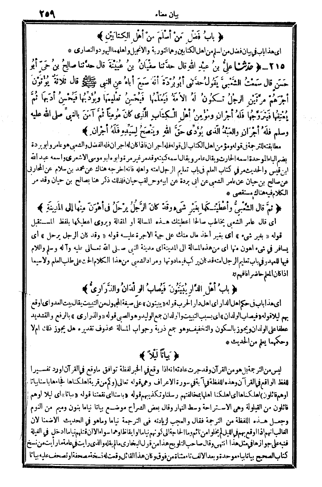 1103 - حدَّثنا عَلِيُّ بنُ عَبْدِ الله قَالَ حدَّثنا سُفْيَانُ بنُ عُيَيْنَةَ قَالَ حدَّثنا صالِحُ بنُ حَيٍّ أبُو حَسَنٍ قَالَ سَمِعْتُ الشَّعْبِيَّ يَقُولُ حدَّثني أبُو بُرْدَةَ أنَّهُ سَمِعَ أبَاهُ عنِ النبِيِّ صلى الله عَلَيْهِ وَسلم قَالَ ثلاثَةٌ يُؤْتُونَ أجْرَهُمْ مَرَّتَيْنِ الرجُلُ تكُونُ لَهُ الأمَةُ فيُعَلِّمُهَا فيُحْسِنُ تَعْلِيمَها ويُؤدِّيهَا فيُحْسِنُ أدَبَها ثُمَّ يُعْتِقُها فيَتَزَوَّجُها فلَهُ أجْرَانِ ومُؤمِنُ أهْلِ الكِتَابِ الَّذِي كانَ مُؤْمِناً ثُمَّ آمَنُ بالنَّبِيِّ صلى الله عَلَيْهِ وَسلم فلَهُ أجْرَانِ والعَبْدُ الَّذِي يُؤَدِّي حَقَّ الله ويَنْصَحُ لِسَيِّدِهِ فلَهُ أجْرَانِ..