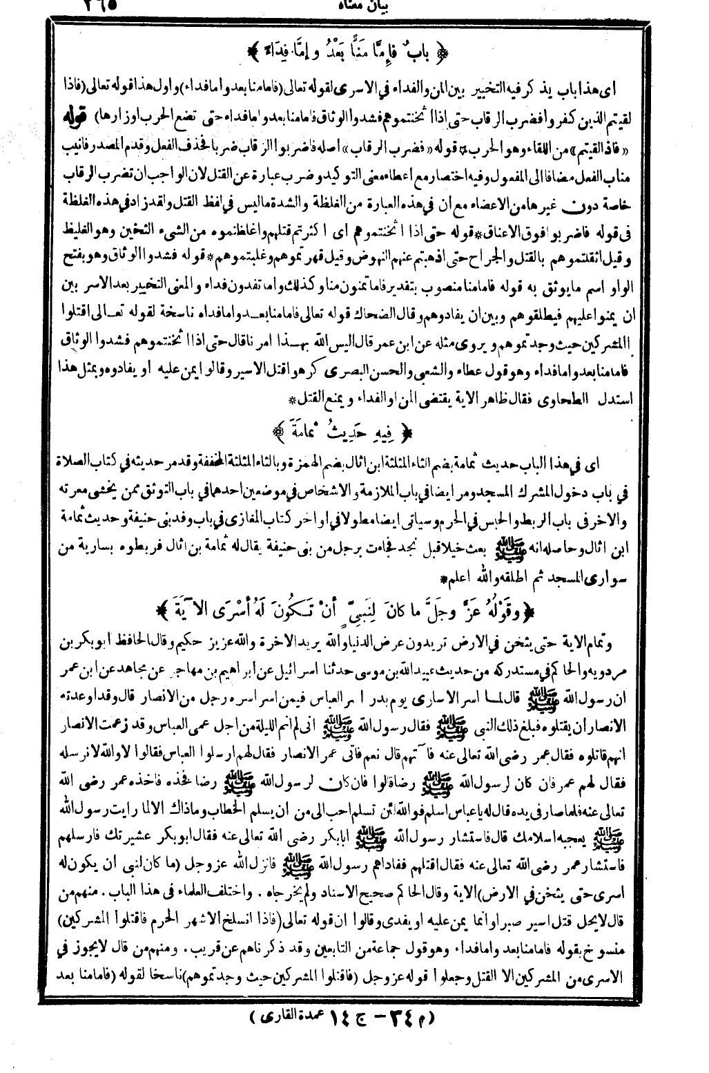 أَي: هَذَا بَاب يذكر فِيهِ التَّخْيِير بَين الْمَنّ وَالْفِدَاء فِي الأسرى. لقَوْله تَعَالَى: {فإمَّا منا بعد وَإِمَّا فدَاء} وَأول هَذَا قَوْله تَعَالَى: {فَإِذا لَقِيتُم الَّذين كفرُوا فَضرب الرّقاب حَتَّى إِذا أثخنتموهم فشدوا الوثاق فإمَّا منا بعد وَإِمَّا فدَاء حَتَّى تضع الْحَرْب أَوزَارهَا} (مُحَمَّد: 04) . قَوْله: {فَإِذا لَقِيتُم} من اللِّقَاء وَهُوَ الْحَرْب. قَوْله: {فَضرب الرّقاب} (مُحَمَّد: 04) . أَصله: فاضربوا الرّقاب ضربا، فَحذف الْفِعْل وَقدم الْمصدر فأنيب مناب الْفِعْل مُضَافا إِلَى الْمَفْعُول، وَفِيه اخْتِصَار مَعَ إِعْطَاء معنى التوكيد، وَضرب: عبارَة عَن الْقَتْل، لِأَن الْوَاجِب أَن تضرب الرّقاب خَاصَّة دون غَيرهَا من الْأَعْضَاء مَعَ أَن فِي هَذِه الْعبارَة من الغلظة والشدة مَا لَيْسَ فِي لفظ الْقَتْل، وَلَقَد زَاد فِي هَذِه الغلظة فِي قَوْله: فاضربوا فَوق الْأَعْنَاق. قَوْله: {حَتَّى إِذا أثخنتموهم} (مُحَمَّد: 04) . أَي: أَكثرْتُم قَتلهمْ وأغلظتموه، من الشَّيْء الثخين وَهُوَ الغليظ وَقيل: أثقلتموهم بِالْقَتْلِ والجراح حَتَّى أَذهَبْتُم عَنْهُم النهوض، وَقيل: قهرتموهم وغلبتموهم. قَوْله: {فشدوا الوثاق} (مُحَمَّد: 04) . وَهُوَ بِفَتْح الْوَاو: اسْم مَا يوثق بِهِ. قَوْله: {فإمَّا منا} مَنْصُوب بِتَقْدِير: فإمَّا تمنون منا، وَكَذَلِكَ: وَإِمَّا تفدون فدَاء، وَالْمعْنَى: التَّخْيِير بعد الْأسر بَين أَن يمنوا عَلَيْهِم فيطلقوهم وَبَين أَن يفادوهم، وَقَالَ الضَّحَّاك: قَوْله تَعَالَى: {فإمَّا منا بعد وَإِمَّا فدَاء} (مُحَمَّد: 04) . ناسخة لقَوْله تَعَالَى: {اقْتُلُوا الْمُشْركين حَيْثُ وَجَدْتُمُوهُمْ} (التَّوْبَة: 5) . ويروى مثله عَن ابْن عمر، قَالَ: أَلَيْسَ الله بِهَذَا أمرنَا، قَالَ: {حَتَّى إِذا أثخنتموهم فشدوا الوثاق فإمَّا منا بعد وَإِمَّا فدَاء} (مُحَمَّد: 04) . وَهُوَ قَول عَطاء وَالشعْبِيّ وَالْحسن الْبَصْرِيّ، كَرهُوا قتل الْأَسير، وَقَالُوا: يمن عَلَيْهِ أويفادوه، وبمثل هَذَا اسْتدلَّ الطَّحَاوِيّ، فَقَالَ: ظَاهر الْآيَة يَقْتَضِي الْمَنّ أَو الْفِدَاء وَيمْنَع الْقَتْل.